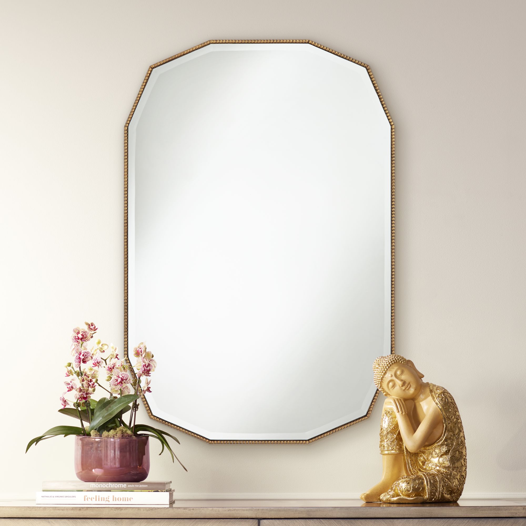 Functional and stylish, this antique gold finish wall mirror is a great addition to any space. Cut corners around the rectangular frame create an oval shape and a pearl trim outlines the mirror. This standout mirror from Noble Park can be installed vertically or horizontally to fit your preference.