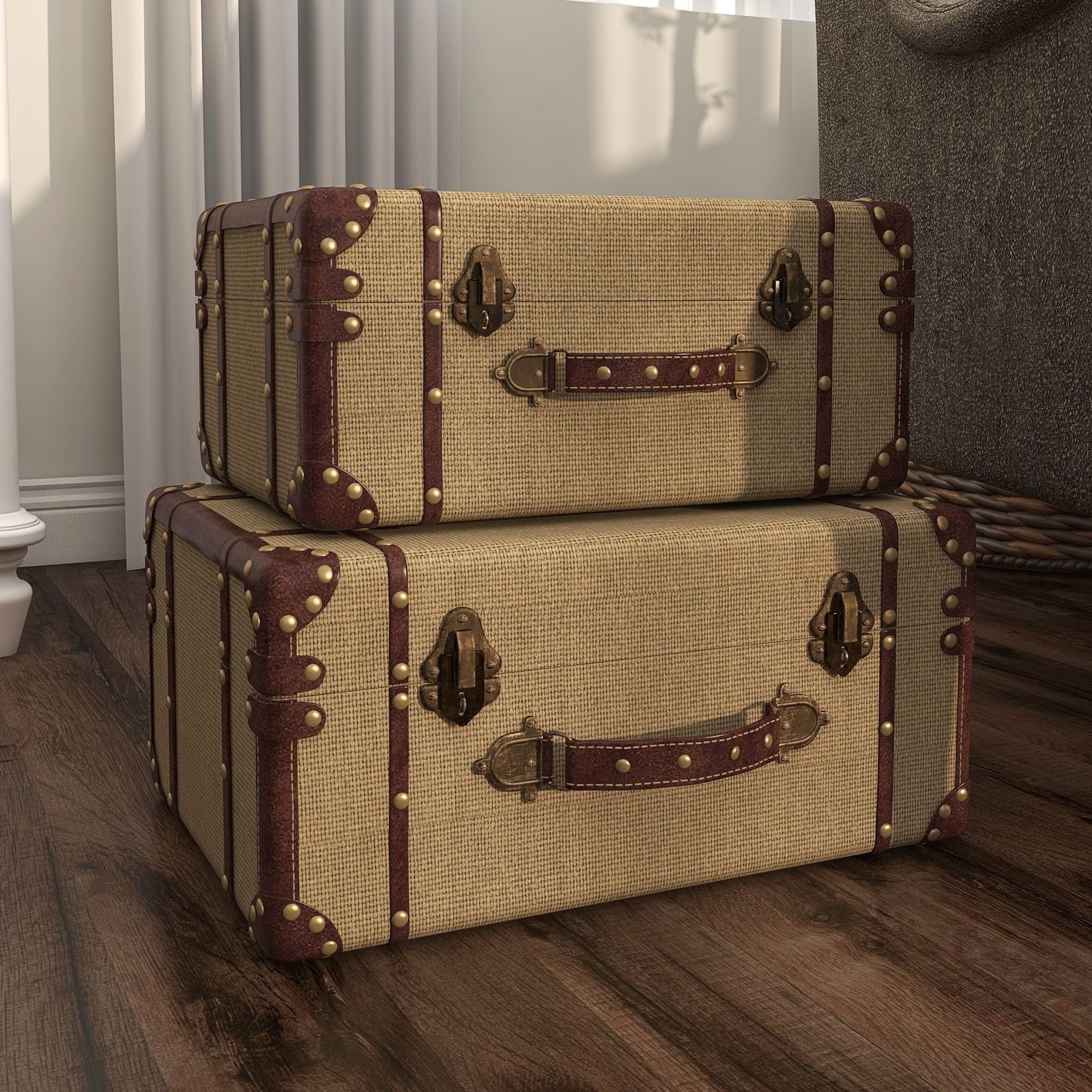 Classic and inspired vintage elements repurpose an old style look as this set of two wood nesting trunks creates character in a bedroom or living space. Wood construction features a textured beige burlap cover, inviting contrasting rich brown faux leather accents and antique-inspired brass studs and hardware. Latch locks and nail head detailing replicate iconic and classic trunk designs once used for travel. Trimmed with leather handles and stacked in a graduated silhouette, this set offers the romantic influence of the late 19th century.