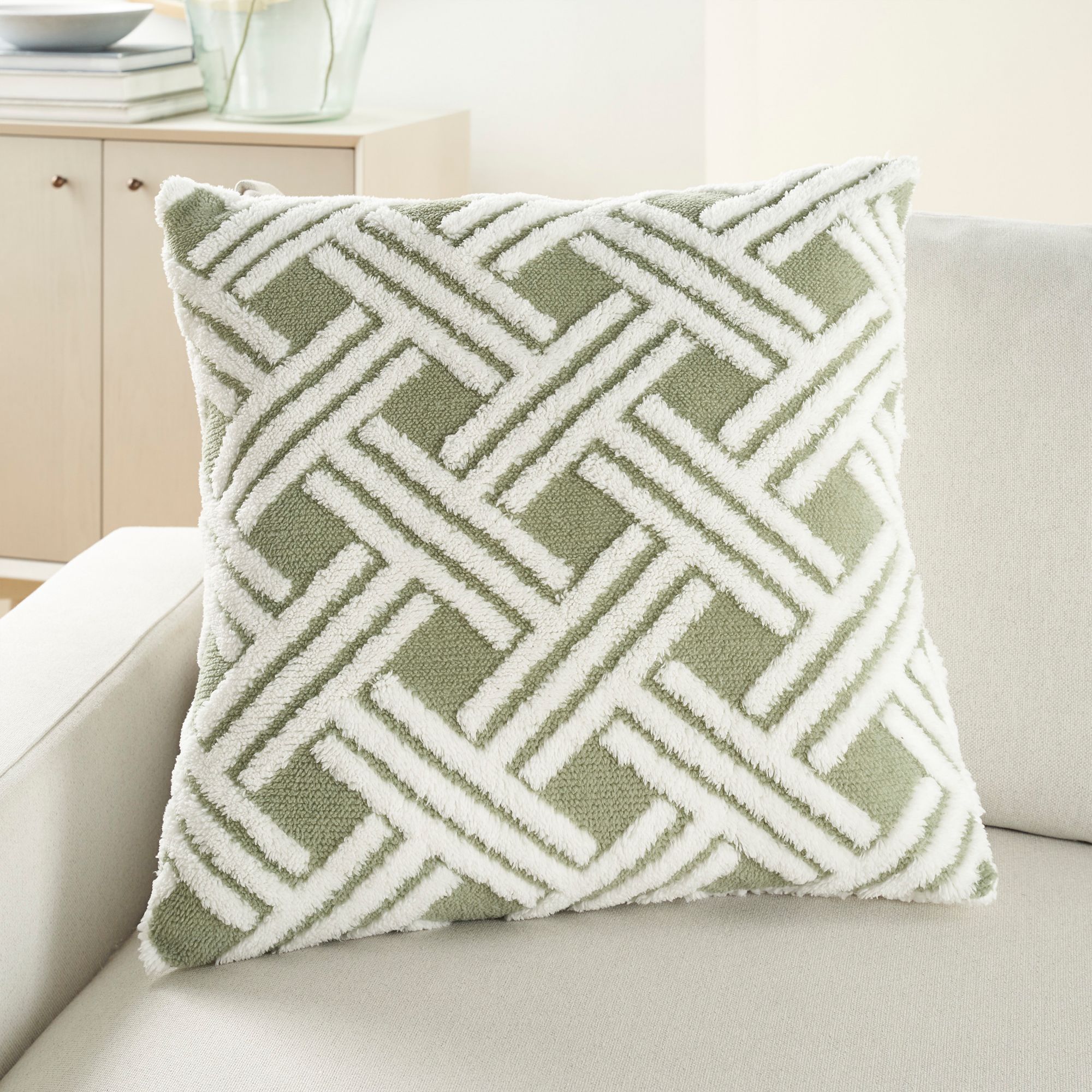 Designed by Nourison, this square decorative throw pillow presents a faux fur fabric for a deep plush look and feel. Across the faux fur is a charming traditional basketweave pattern in an earthy sage green and white color tone that lends a vintage vibe. A soft polyester fill and zipper closure allows you to reshape and tuft this hand-made accent pillow to fit the scene.