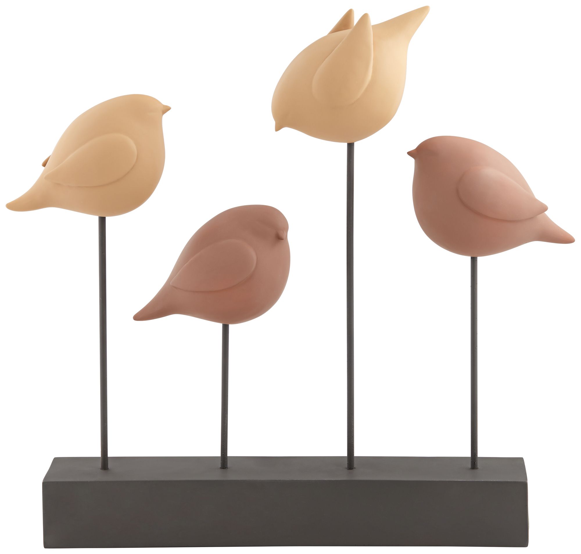 - Matte terracota brown and tan finish birds. Black finish rectangular base. Polyresin construction.