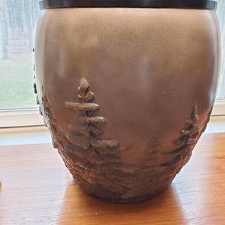 - Green fir tree pattern set against an lighter background. Antique copper finish accents at the neck. Hand-tinted cast resin construction, colors may vary slightly.