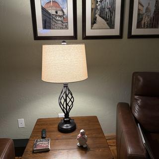 - Set of two transitional rustic table lamps by the Franklin Iron Works brand. Ideal for farmhouse or rustic room decor.