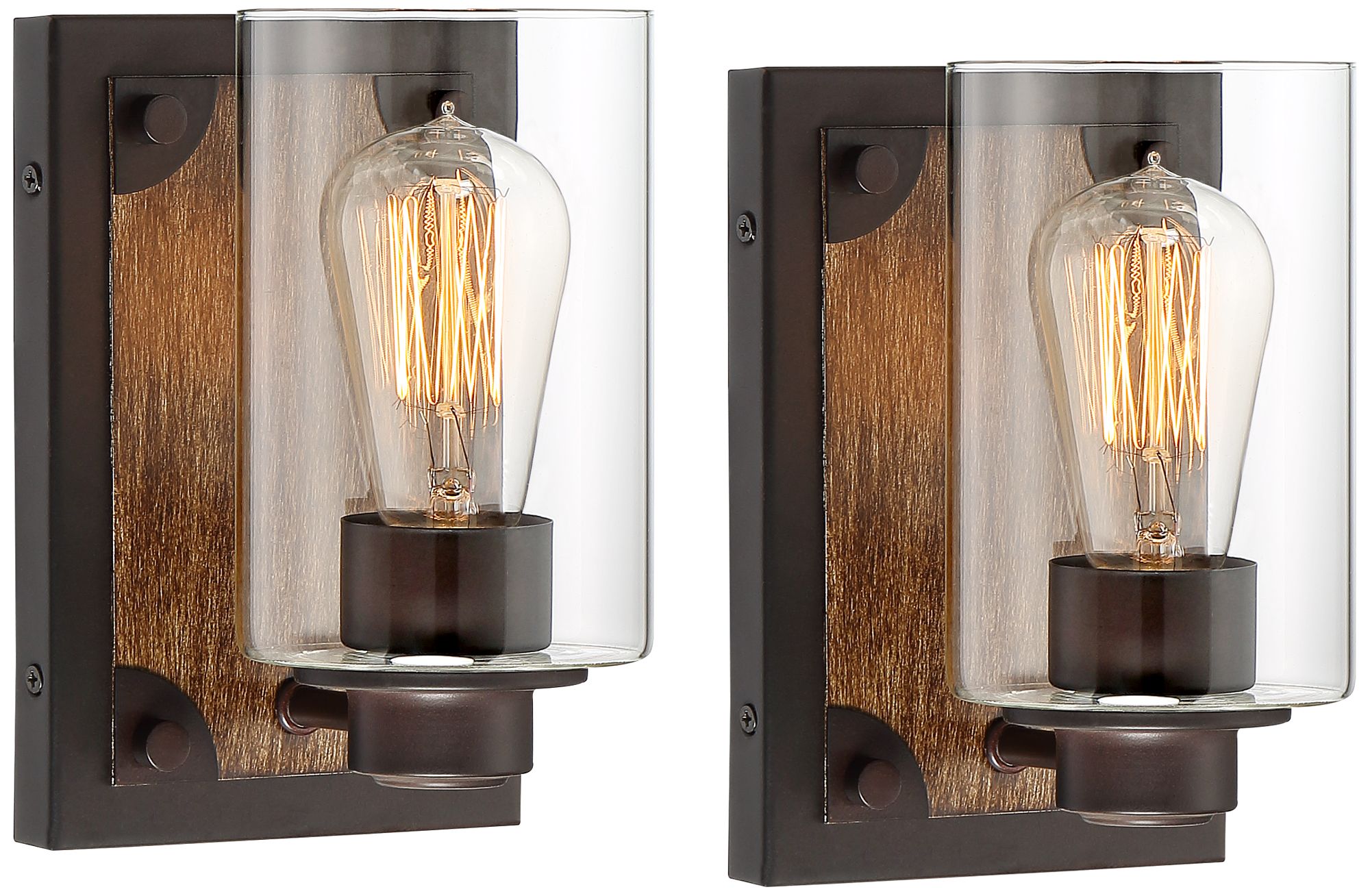 From the Buford collection by Franklin Iron Works, these rustic wall sconces evoke a feeling of farmhouse nostalgia. Each comes with a bronze finish steel frame, with a layer of wood covering the faceplate for a charming effect. The clear glass shades give a full view of the bulbs used inside, making decorative light bulbs a great choice for this fixture. Vertical installation only.