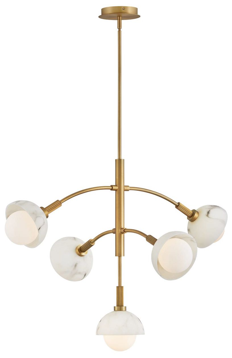 Opposing influences balance Phoebe's multi-tier chandelier with a transitional twist. This dynamic modern-style design commands attention with ribbed stem detail, faux alabaster and cased opal glass combination, with a bold Heritage finish.