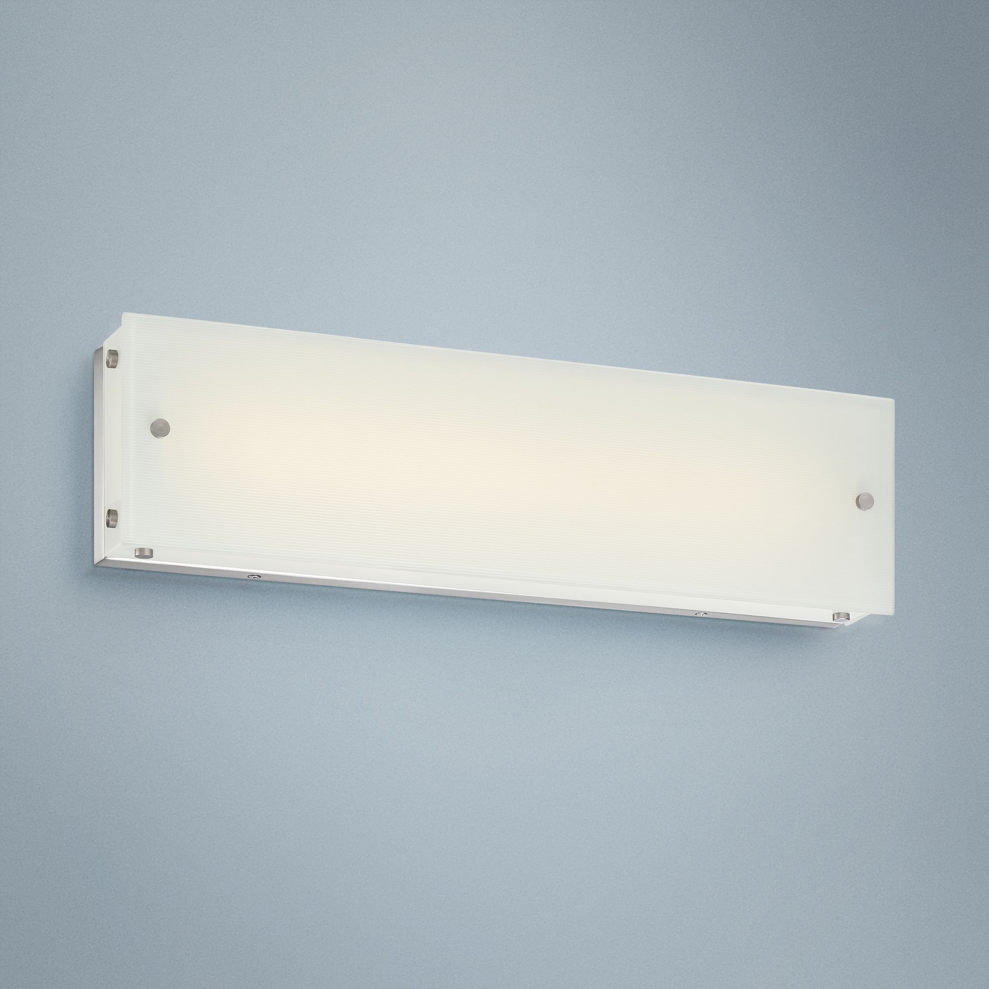 This medium LED bath light has a minimalist look and profile, on a rectangular metal frame finished in brushed nickel. A panel of frosted white glass diffuses the energy-efficient LED module inside and distributes the light evenly into your space. Part of the George Kovacs Button home lighting collection.