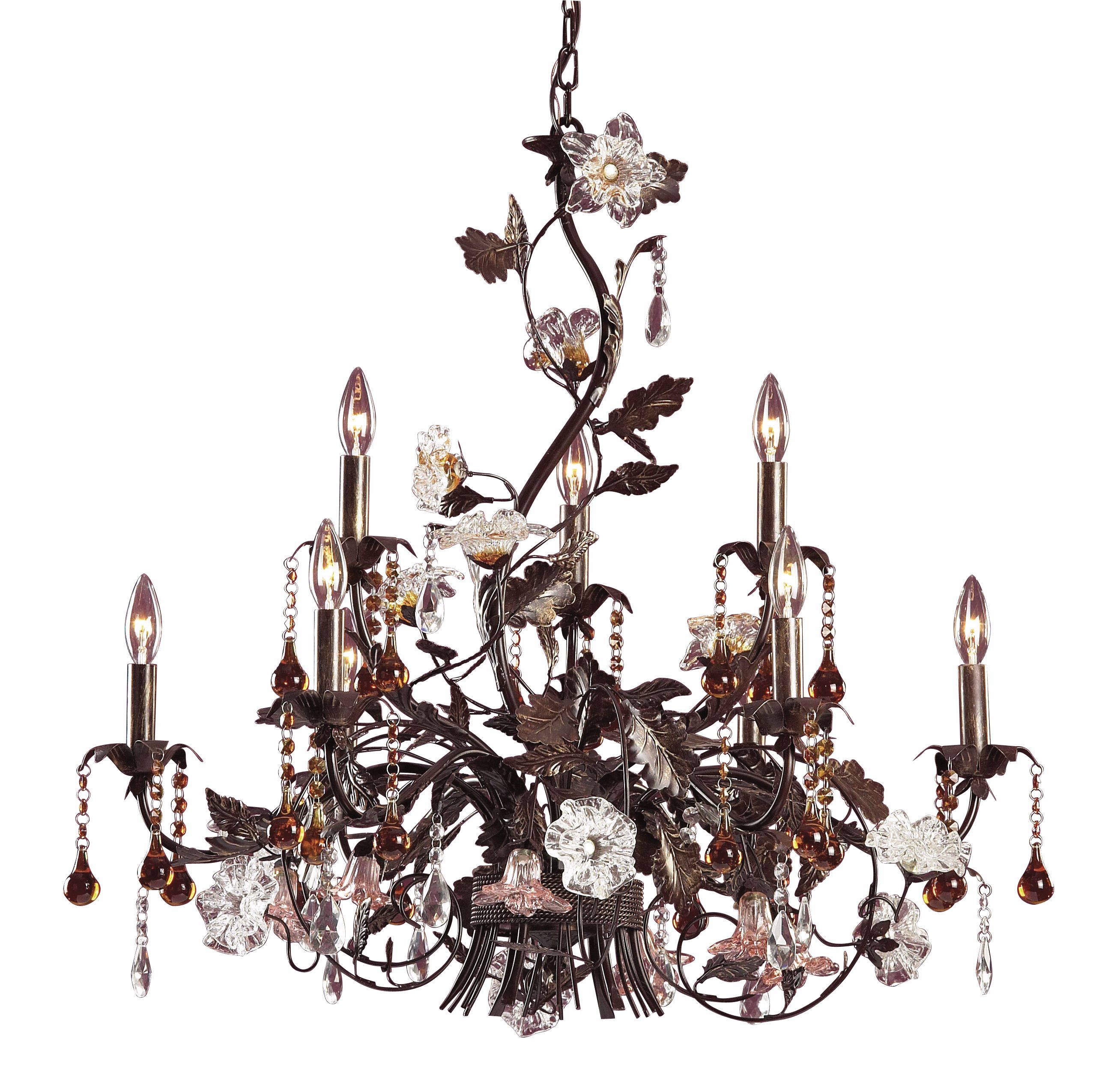 Lavish and lovely, this is a unique fixture. Inspired by Italian designs, this blossoming chandelier has a graceful style. The refined light features a deep rust finish frame draped by an array of hand-blown glass florets. The timeless vine and leaf motif design is accented by drops of amber and clear crystal. This fine quality ceiling light will bring an old world feel to your decor.