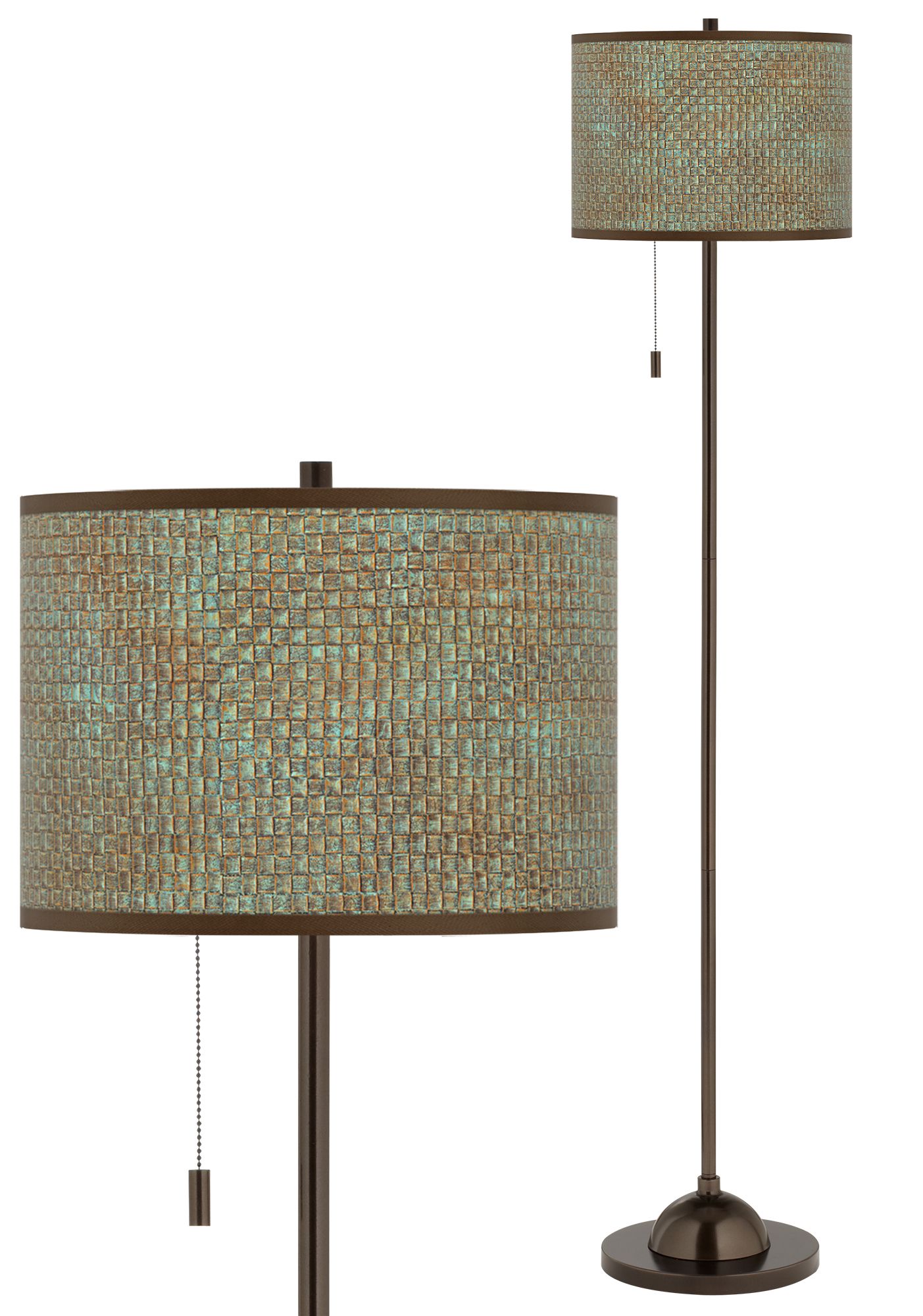 Add style to your favorite room with this club style floor lamp. The lamp comes in a tiger bronze finish and has a slim profile perfect for seating areas, bedrooms and more. Up top is a drum shade with a stylish Interweave Patina printed giclee pattern. An on-off pull chain hangs below the shade within easy reach. Custom made-to-order shade design. Shade printing process U.S. Patent # 7,347,593.