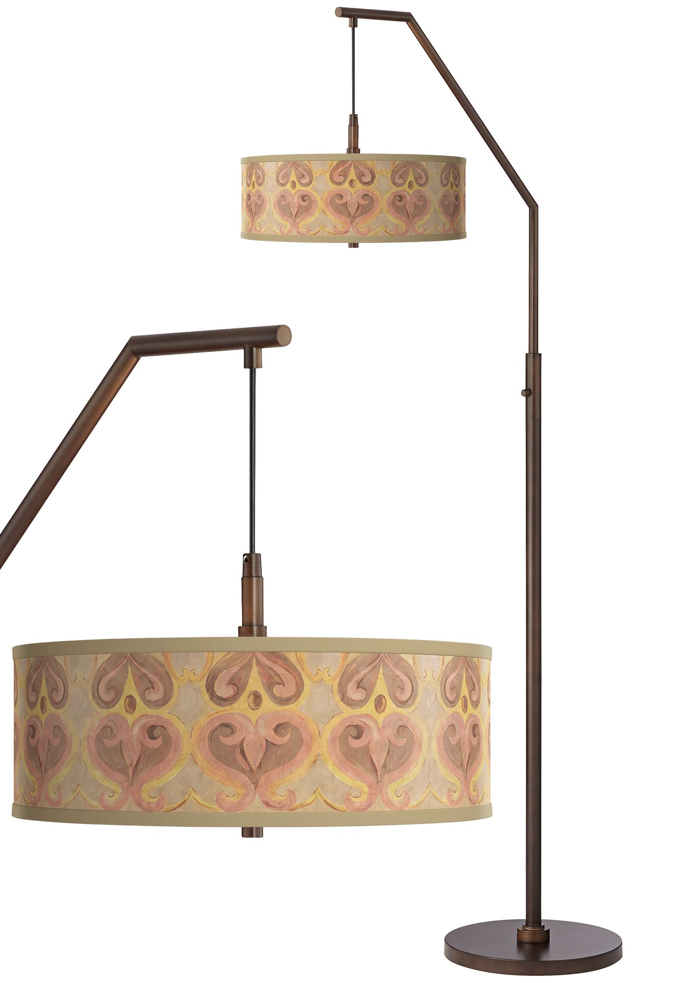 Add style with this contemporary arcing floor lamp. This design offers a modern look with a warm, handsome touch. It features an oil-rubbed bronze finish and a drum shade with a Aurelia giclee pattern and a bottom diffuser to prevent glare. The stem switch allows for two different lighting levels for ultimate convenience.