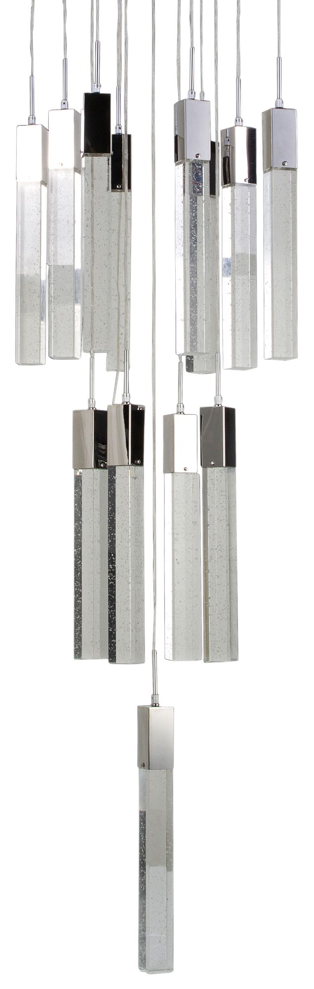 - Contemporary thirteen-light energy-efficient LED multi light pendant.