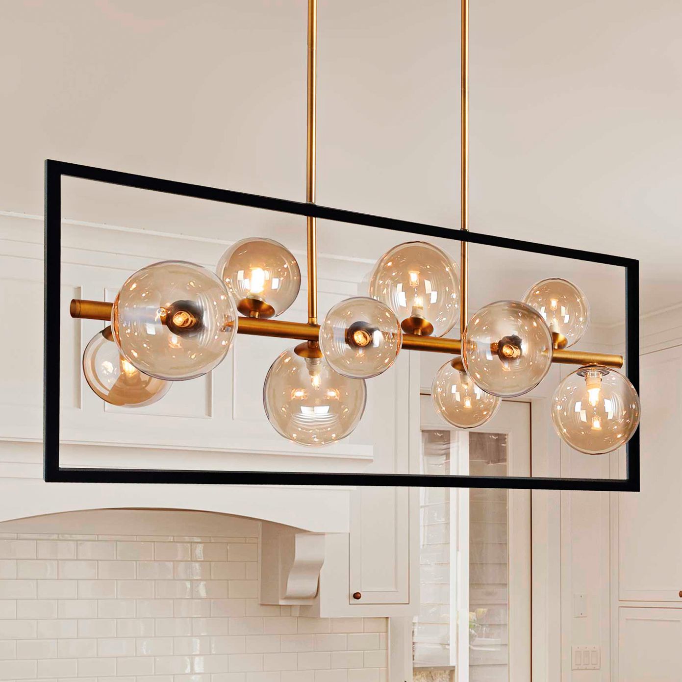 Celebrate eclectic style with the singular vibe of the modern ten-light linear pendant from the Glasgow collection. A vintage bronze finish over metal components comprises the open frame that surrounds a group of champagne glass globe shades. These components are supported by thin metal pieces suspended from above, giving the composition a strong geometric flair.