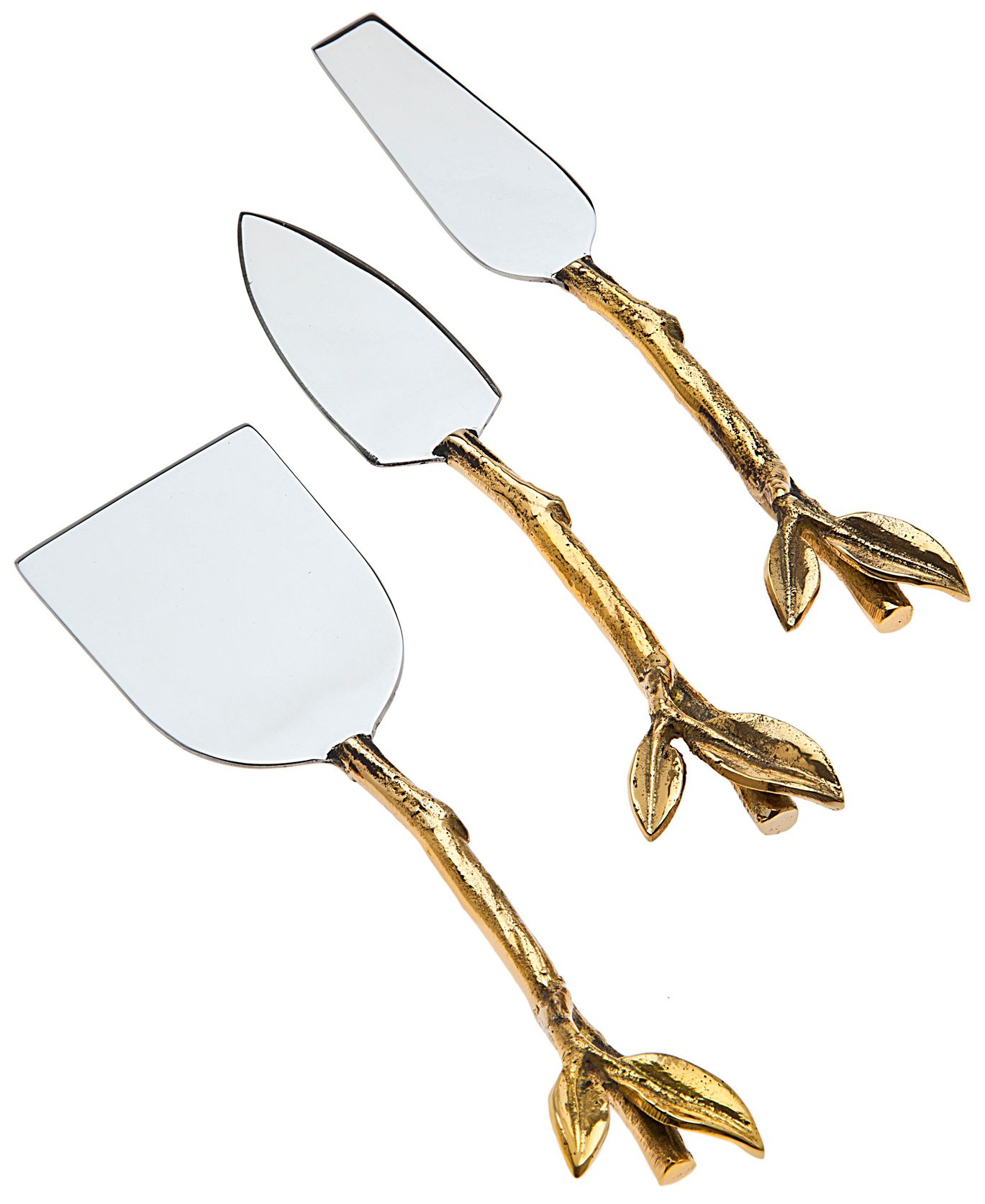 Add a touch of character to your next wine and cheese night with this rustic two-tone set of three cheese servers. This woodland themed utensil set includes one pointed knife, one narrow-bladed knife, and one wide-bladed knife. Each piece boasts a stunning silver-plated blade and a go dinger leaf finish twig and leaf handle design.