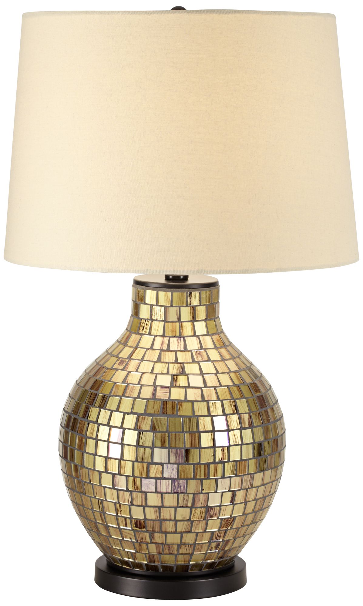 Let this brilliant table lamp double as a piece of art in your home. The jar-style base is covered in sparkling gold glass mosaic tiles, and a beige drum shade sits above for a clean look. A lovely choice atop any sofa table, nightstand, or dresser.
