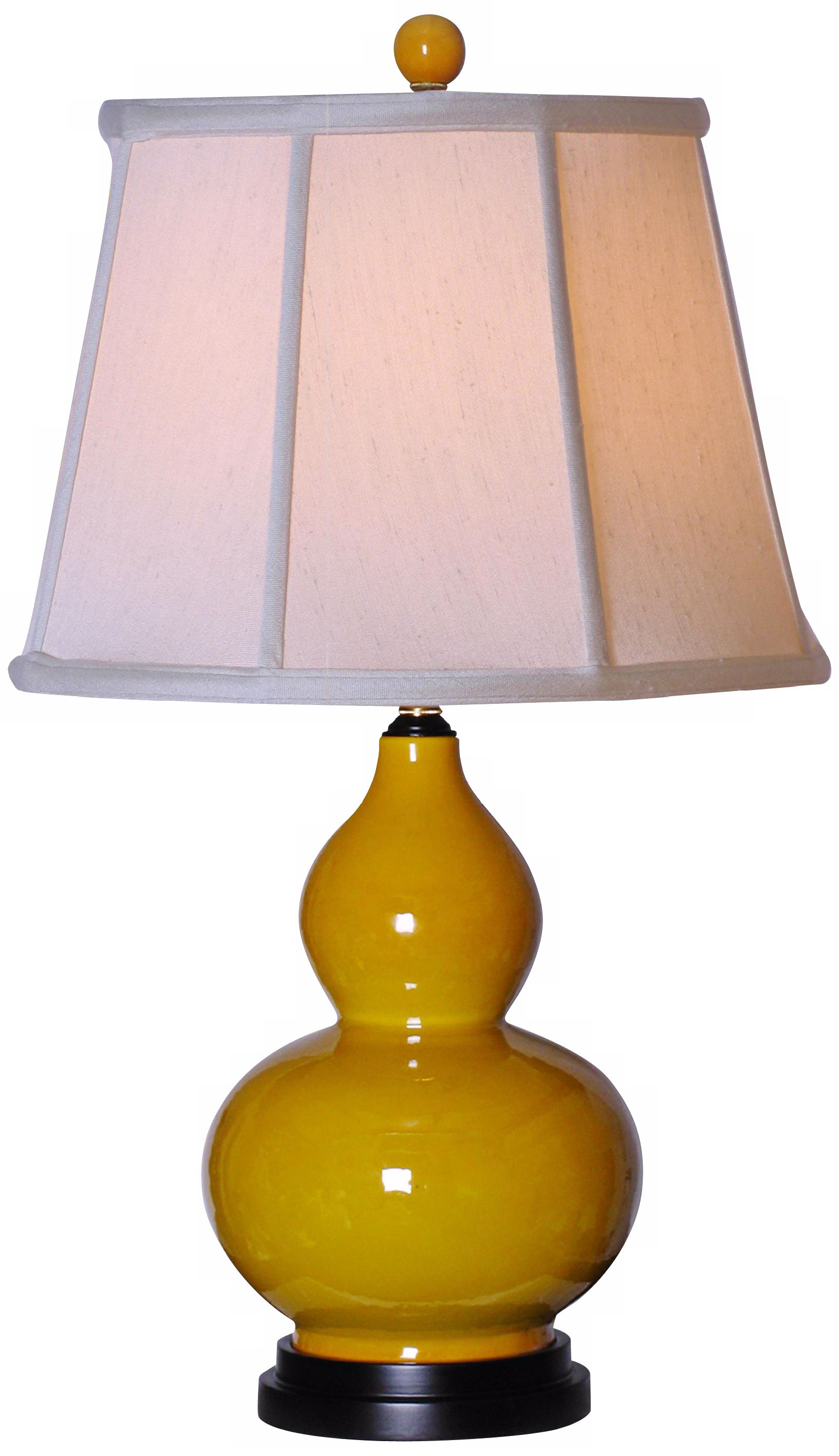 This graceful table lamp looks great in a living room or bedroom, and is a perfect for a variety of decors. It features a sculpted porcelain gourd base in a rich golden yellow finish. An off white ribbed, fabric shade sits on top. Three-way socket gives you more lighting control.