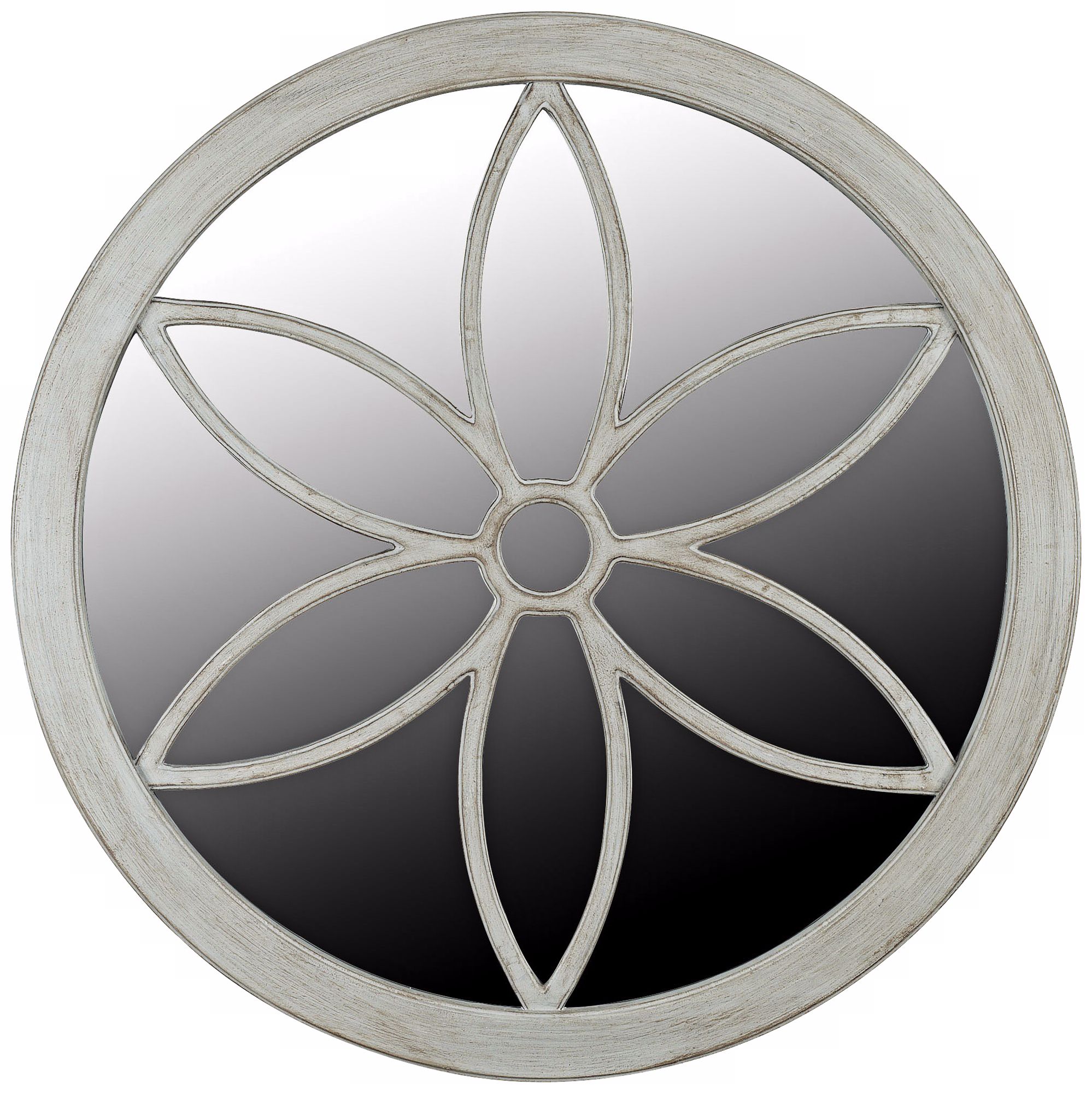 Inside the antique white finish of this round frame is a gorgeous round mirror. A stylized flower draws your eye to the center of the mirror then sends it gazing at each petal. Perfect for a country cottage or antique decor, or as a cheerful accent piece in an eclectic-decor home.