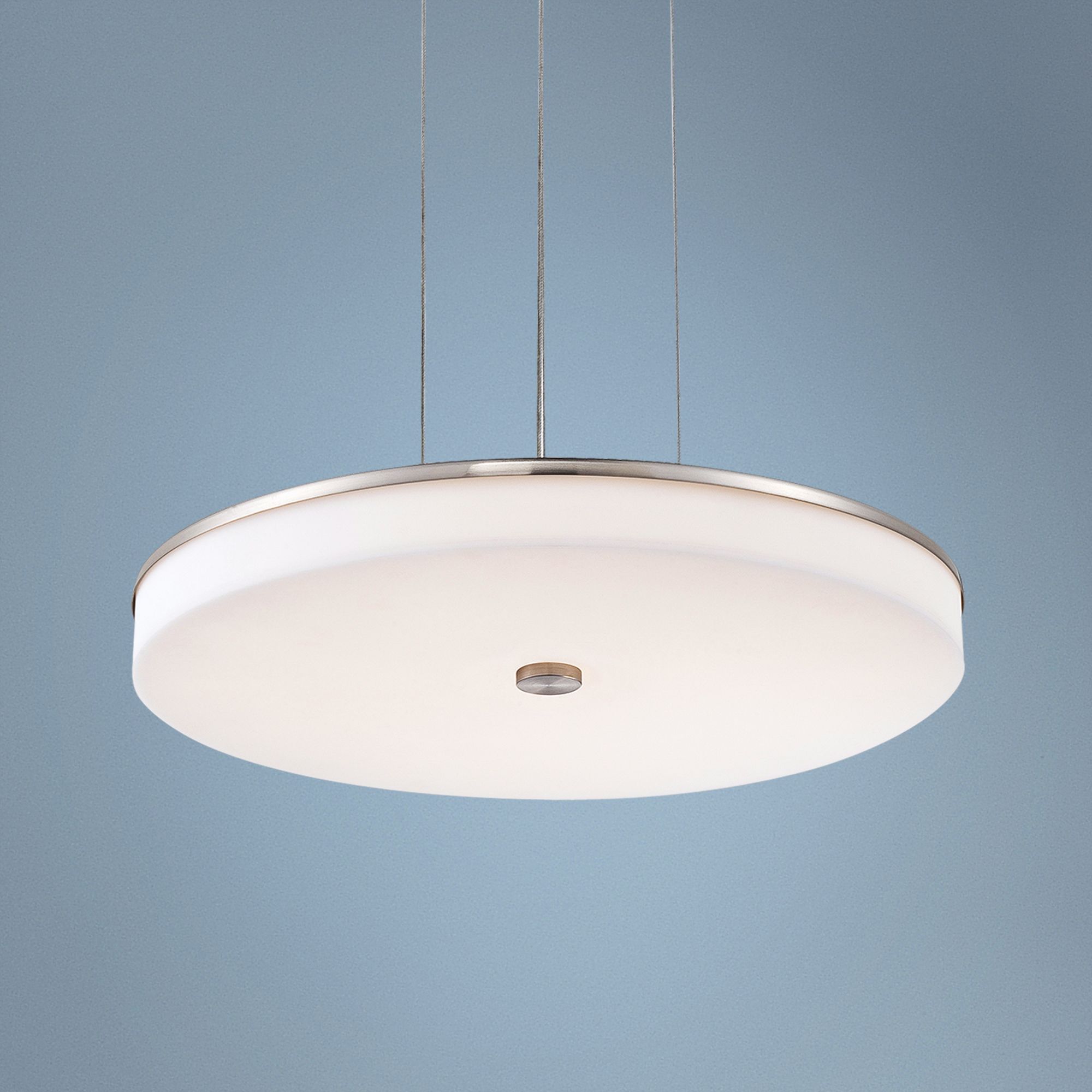This pendant light is perfectly versatile and has a crisp contemporary look. A white acrylic shade offers warm illumination for bathrooms, kitchens, hallways, and more. This fixture also features an LED design, so you can save energy in style. From George Kovacs.