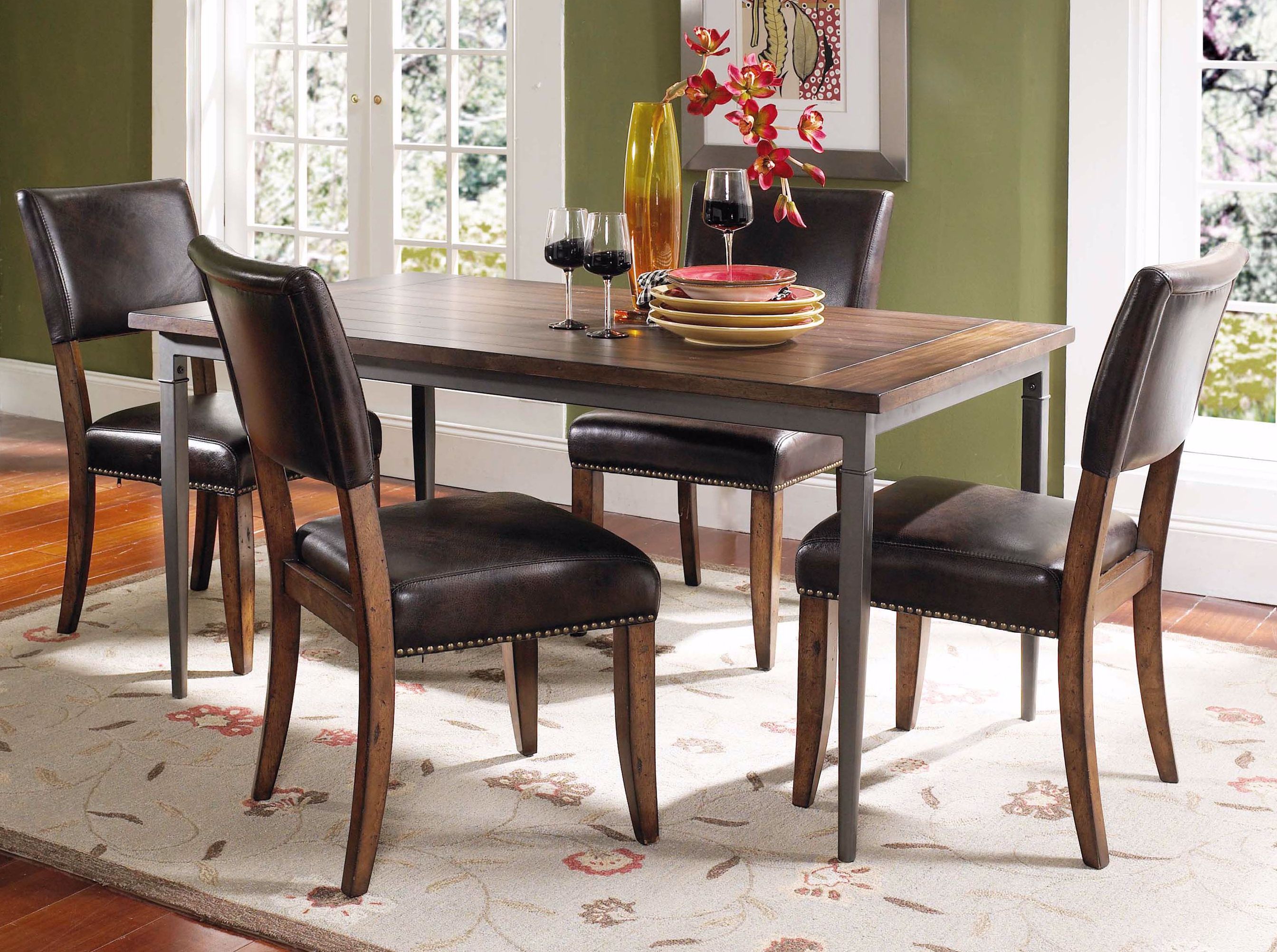 The table and stools in this 5-piece dining set combine warm wood finish with dark gray metal, incorporating traditional details with contemporary touches. The rectangle table with a chestnut brown wood top and dark gray metal straight legs can easily accommodate 6. The four parsons chairs feature cushioned faux leather seats and backs. From Hillsdale.