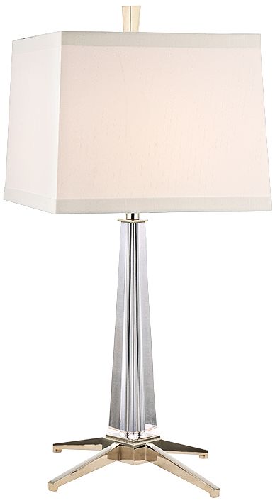 A sleek and gleaming celebration of form, the Hindeman polished nickel finish table lamp by Hudson Valley is mid-century modern function at its finest. This lamp features a tapered crystal column, with a base of angular cast legs - an homage to the iconic lounge chair by renowned mid-century designers Charles and Ray Eames. A square white faux silk shade completes this chic piece. Outfit your living room, bedroom, or entryway with this elegant blend of form and function.