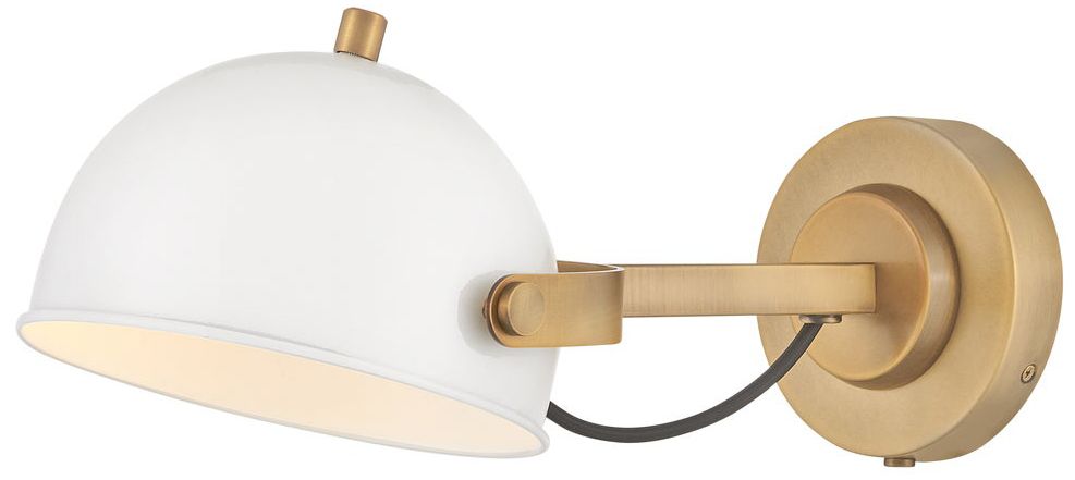 A modern bedside sconce with a vintage feel, Spence's adjustable, rotating shade, painted white interior, and convenient on/off switch create the ideal reading or task light. Heritage Brass details and removable, black, fabric-wrapped cord complement a Black Oxide or Chalk White finish.