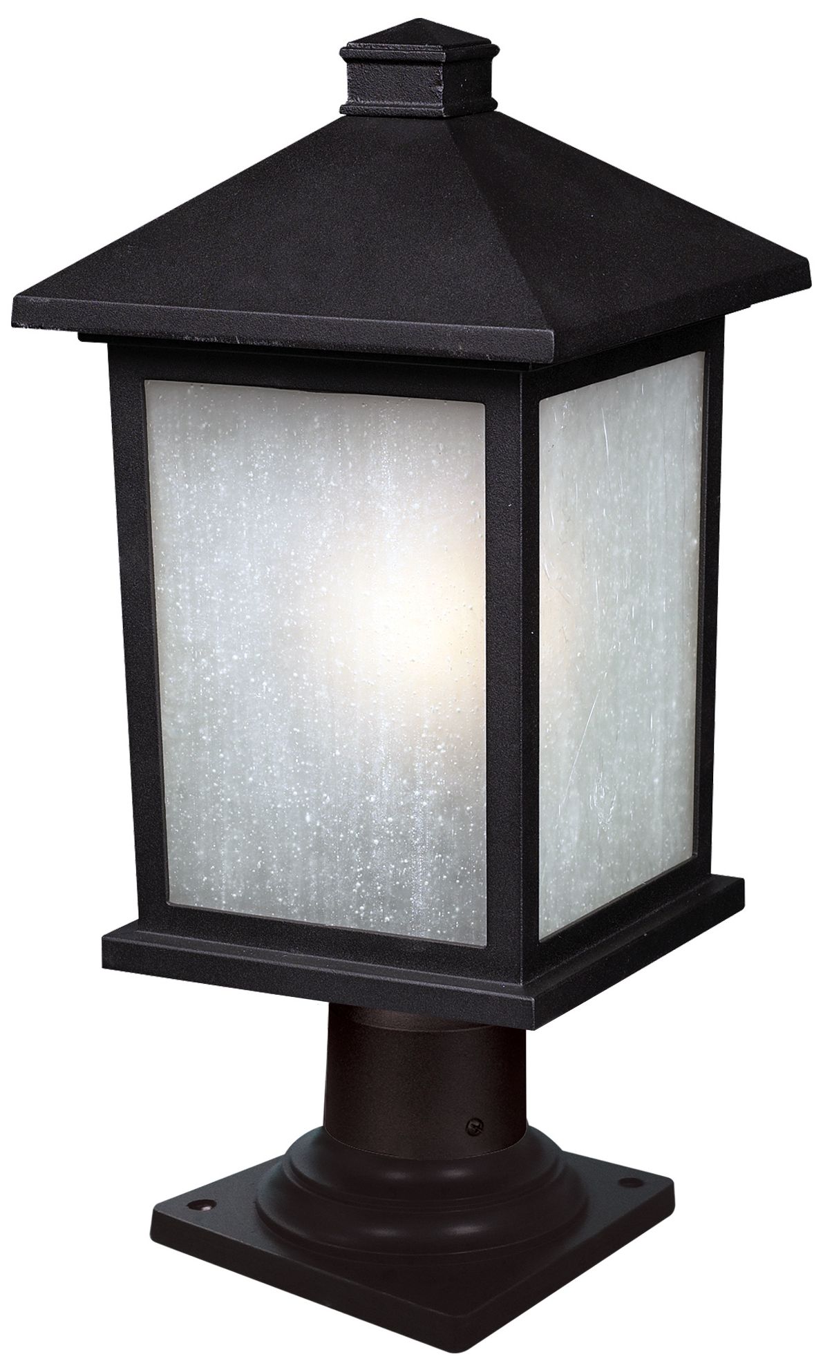 Transform your outdoor setting into an elegant haven with the transitional outdoor lantern pier mount light from the Holbrook collection. Clean, white seedy glass panels complement a black finish, to create a reliably stylish vibe. Made of cast aluminum, this fixture is made to endure nature, regardless of the season.
