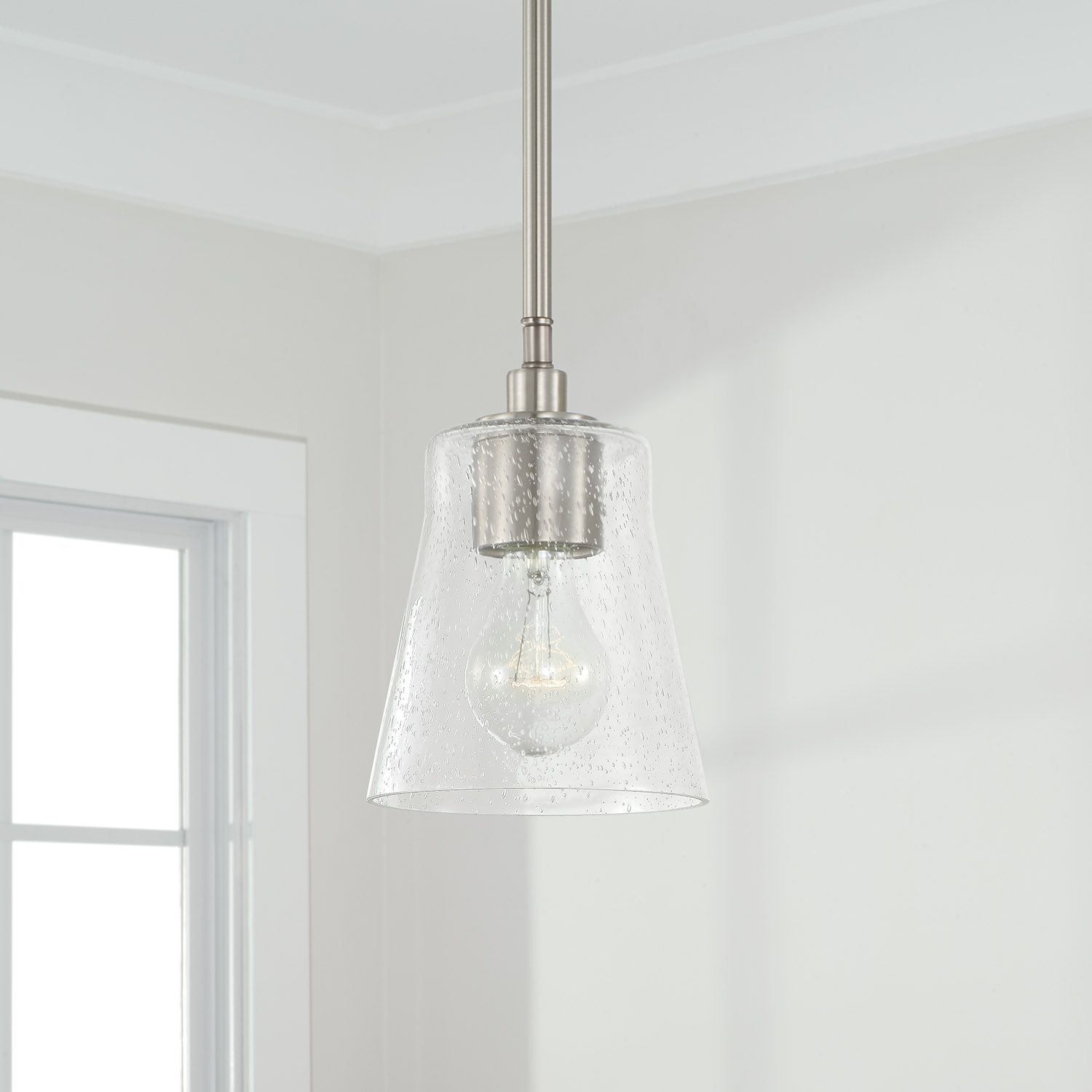 Simple and sleek, the Baker Mini Pendant for Homeplace brings standout style to signature pieces. Whether hung as a pendant or semi-flush, the Brushed Nickel finish beautifully accents the tapered seeded glass for versatility and sophistication.