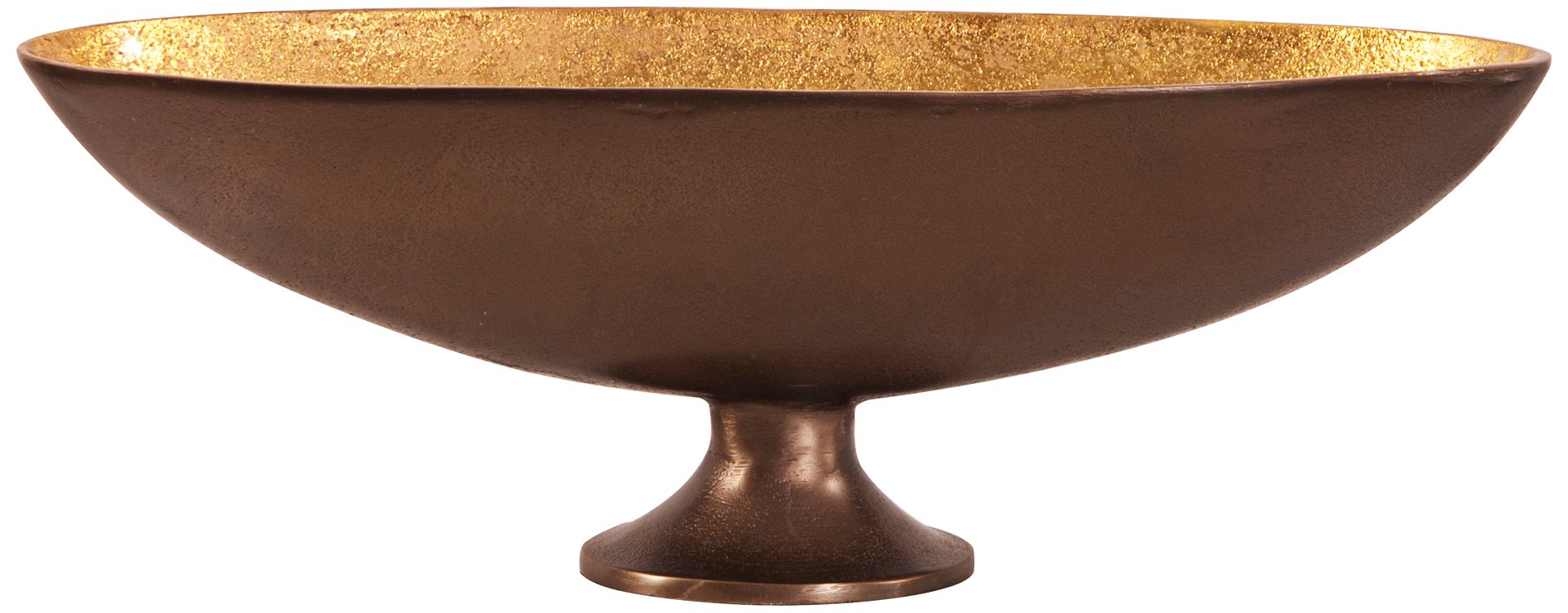 A sleek tapered foot on this medium oblong bowl with a slightly irregular lip adds classic adornment. The warm bronze finish is a classic look enhanced with stunning gold luster over the interior surface of the bowl. A great kitchen or dining room accent, this medium bowl is functional and stylish.