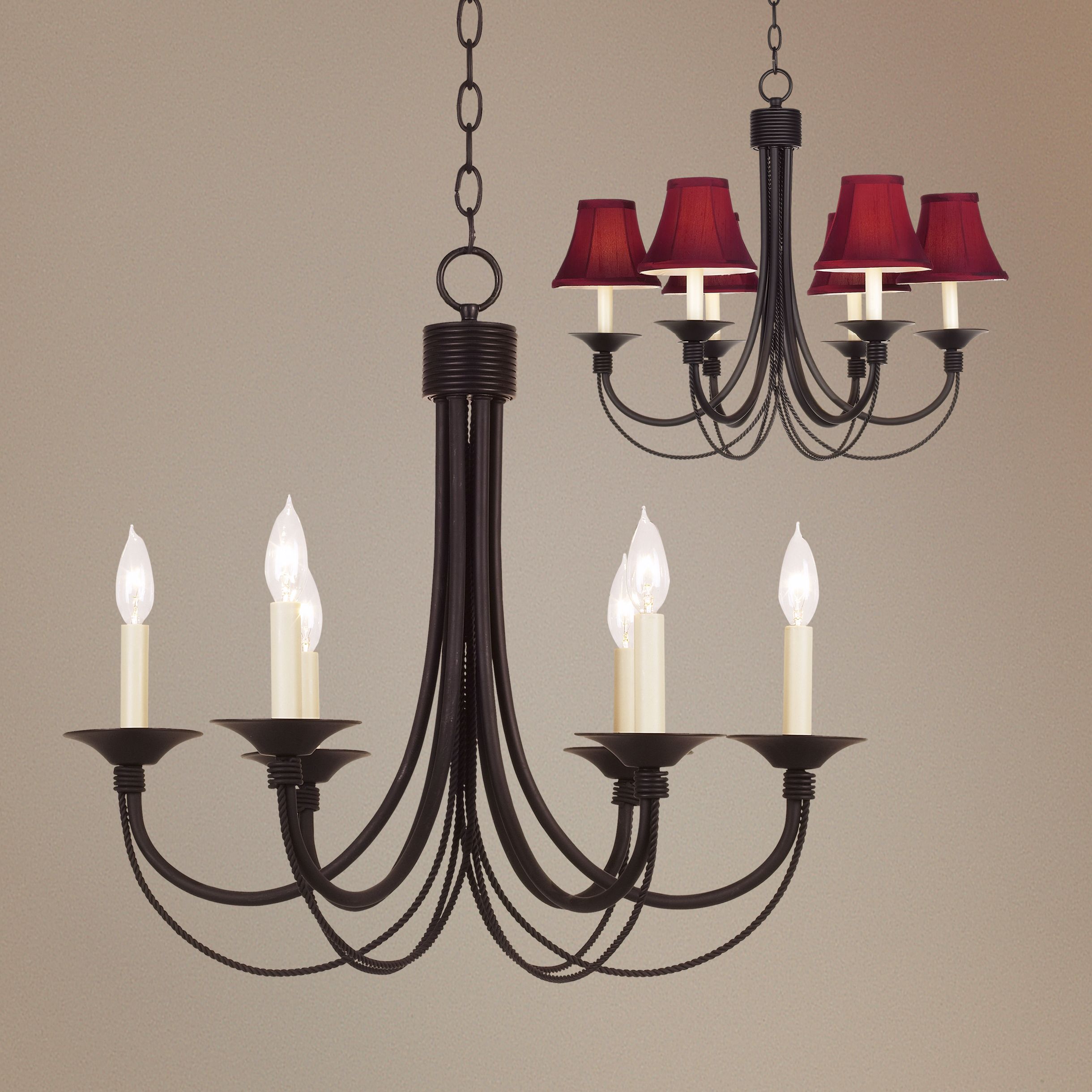Decorate your dining or entry hall area with this handsome iron look chandelier. Simple yet delicate in style, it features six gently curved arms with candelabra style lights. With a traditional flat black finish. Add a clip-on style shade for a decorative look. Shades sold separately and are not included, item number 20434.