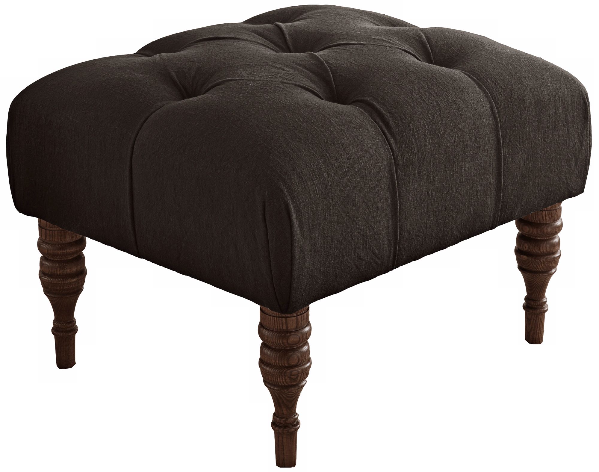 With a beautiful blending of contemporary and retro styles, the U.S.A. crafted Isabelle charcoal linen ottoman offers chic style for the modern living space. It stands on wooden spindle legs that bring a classic look to the hand-tufted design. Spot clean only. Easy to assemble.