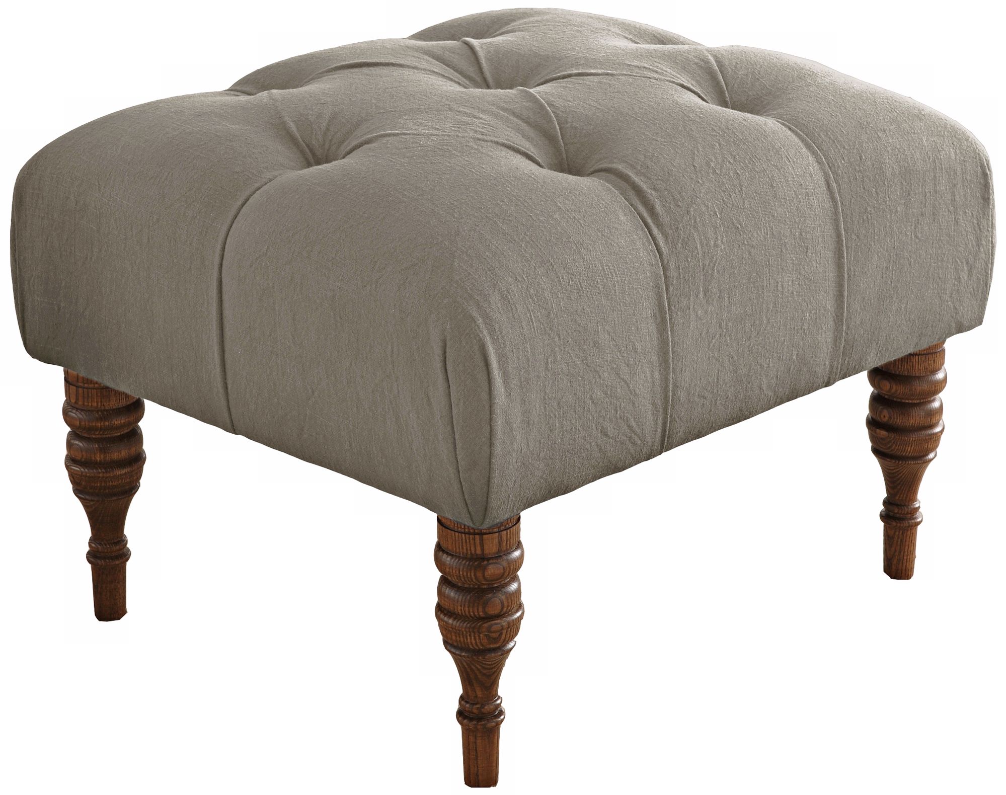 With a beautiful blending of contemporary and retro styles, the Isabelle grey linen ottoman offers chic style for the modern living space. It stands on wooden spindle legs that bring a classic look to the hand-tufted design. Spot clean only. Easy to assemble.