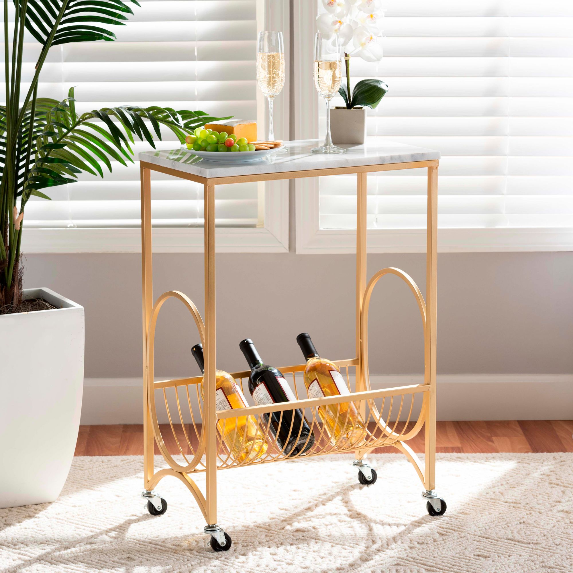 Indulge in a love of entertaining and design in tandem, relishing the high-fashion yet sensible style of a classic. This contemporary metal wine cart gets the job done with ease, featuring a bit of Mid-Century Modern aesthetics. A gold finish metal frame adds design accents as well as efficiency, and a rectangular white marble top embellishes a glam factor. This wine cart is portable with wheels that circulate throughout a room or remain stationary.