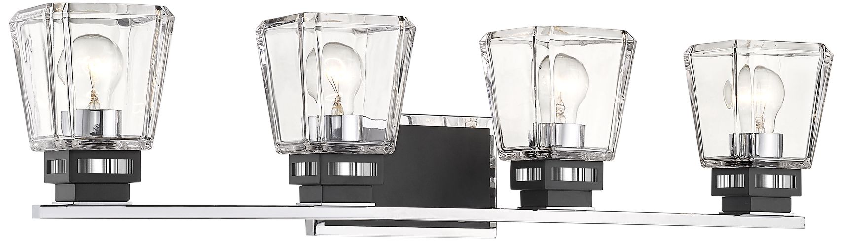 - Matte black finish with chrome finish accents over steel construction. Clear glass shades.