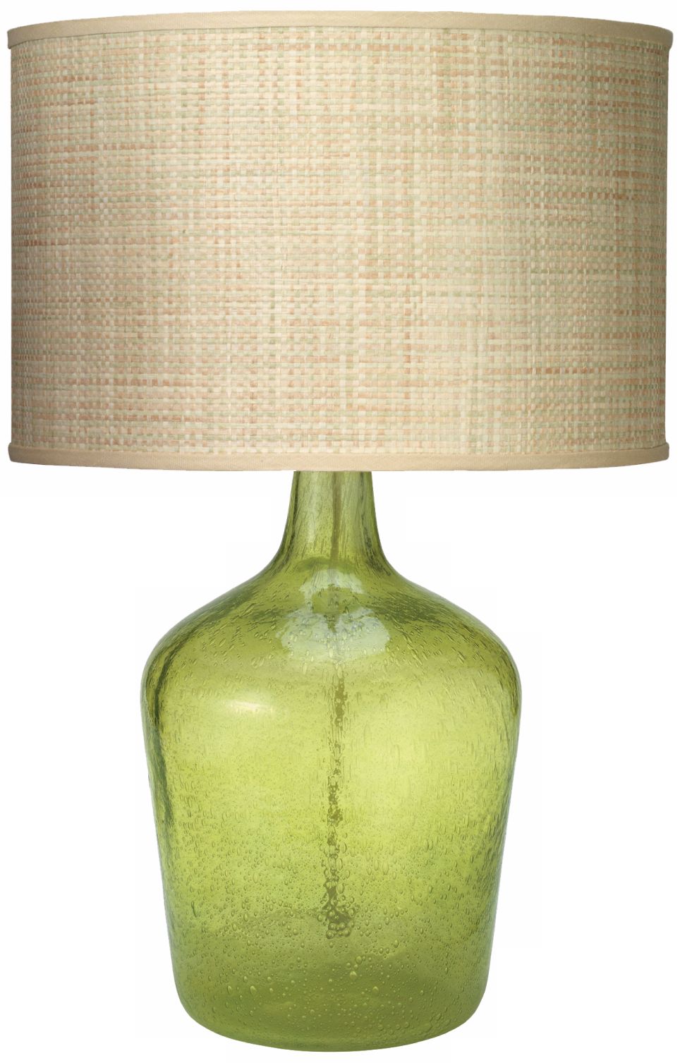 Seeded glass is a hand-blown rough glass where the texture of the glass is the most important design element. This rough and bubbled, hand-made glass table lamp is rustic, yet sophisticated in the way it shines and glistens when light hits its surface. Its seagrass paperweave drum shade adds additional style and texture. A Jamie Young table lamp design.