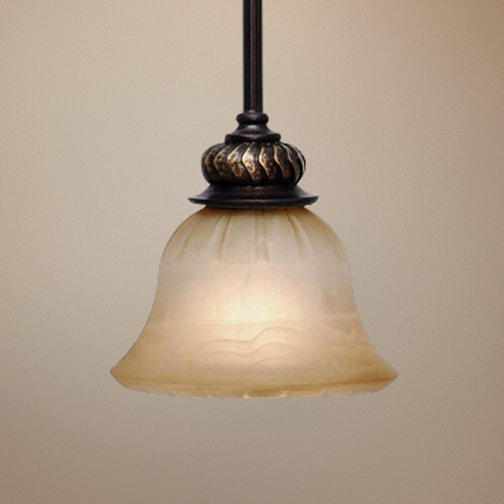 The decorative arm flows down from the canopy of this transitional style mini pendant light. Finished in a dark Etruscan Bronze with rubbed highlights, this lovely design easily coordinates with any number of home color schemes. The thick antique marbled glass shade adds a lighter, warm complement to this wonderful fixture.