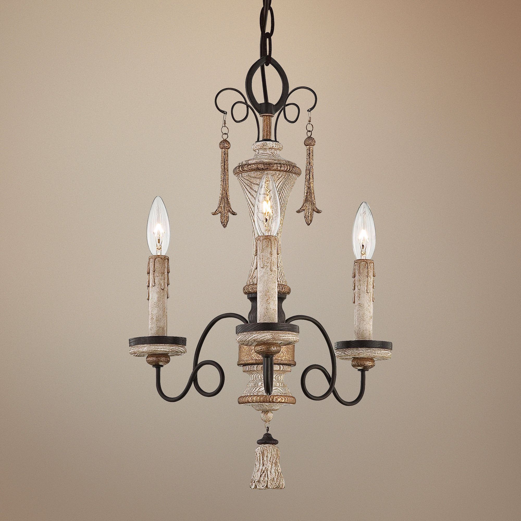 Add a mini chandelier look that's pure romance with this delightful design by Jessica McClintock. Small chandeliers like this make a wonderful accent in bedrooms, hallways and more. This one features three lights and a scroll arm frame. It comes in a Provence patina finish with bronze finish accents.