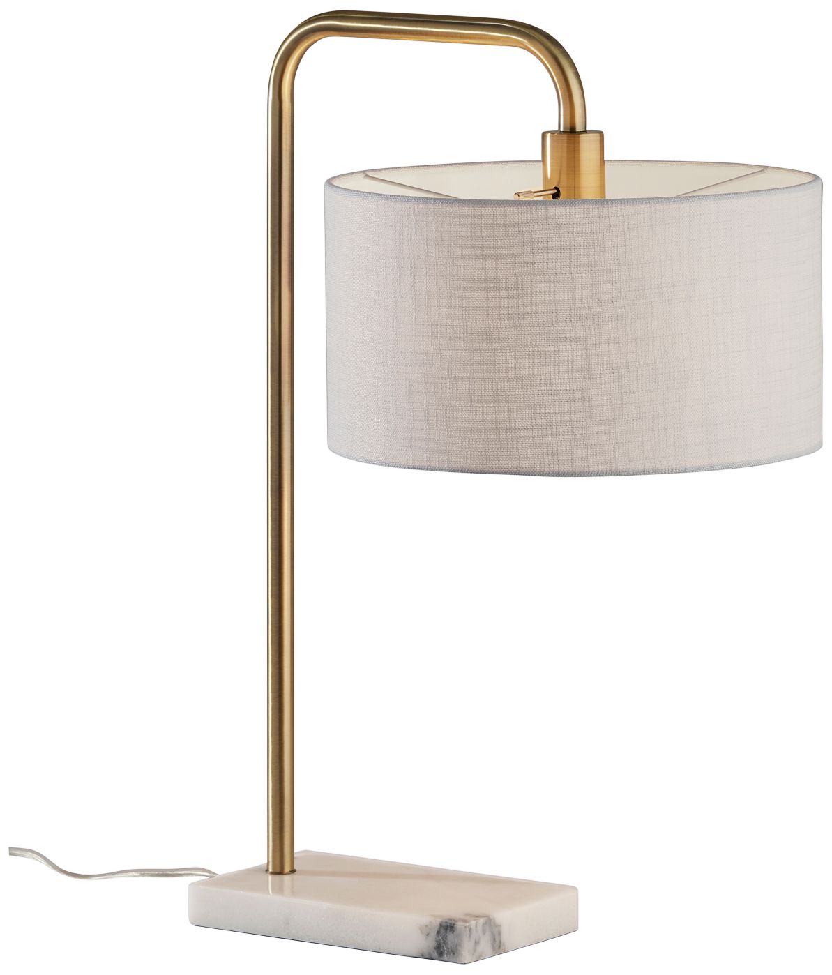 Taking a page from iconic Mid-Century Modern inspiration, this metal table task lamp adds style to function. This lamp from the Justine collection by Adesso creates palette versatility for a wide latitude in coordinating with surrounding decor. A chic white textured fabric drum shade enhances its asymmetrical antique brass finish metal frame and complements a white marble base. Operate this lamp with an on/off rotary socket switch.
