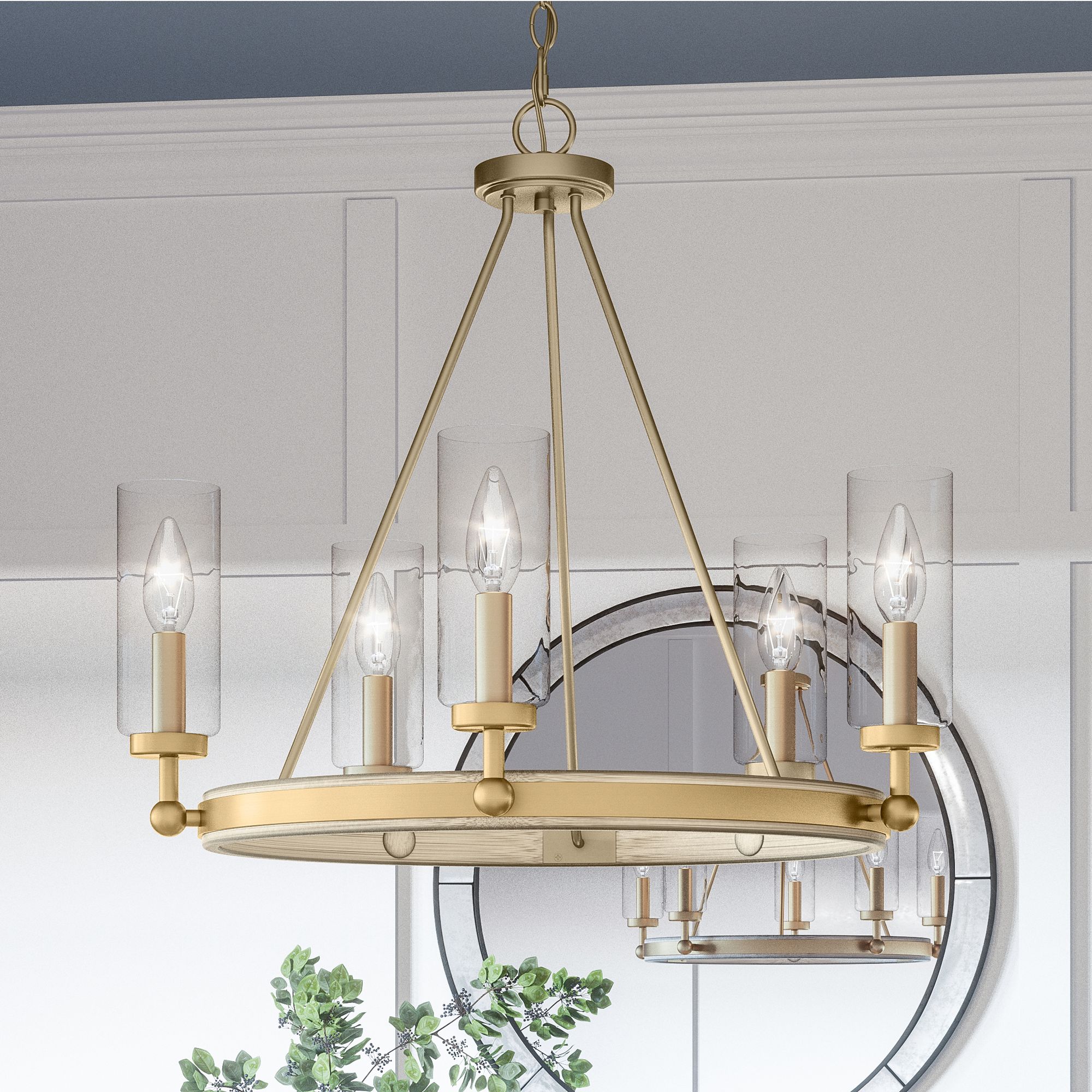 Clear glass cylinders line this transitional five-light wagon wheel chandelier, lending sleek contrast to its nouveau painted weathered brass arc. From the Kelleher collection by Quoizel, gold detailing and latte wood accents provide warmth with a subtle rustic lean. Suspend it above a dining table or in an open-concept kitchen for a balanced blend of polish and ease.