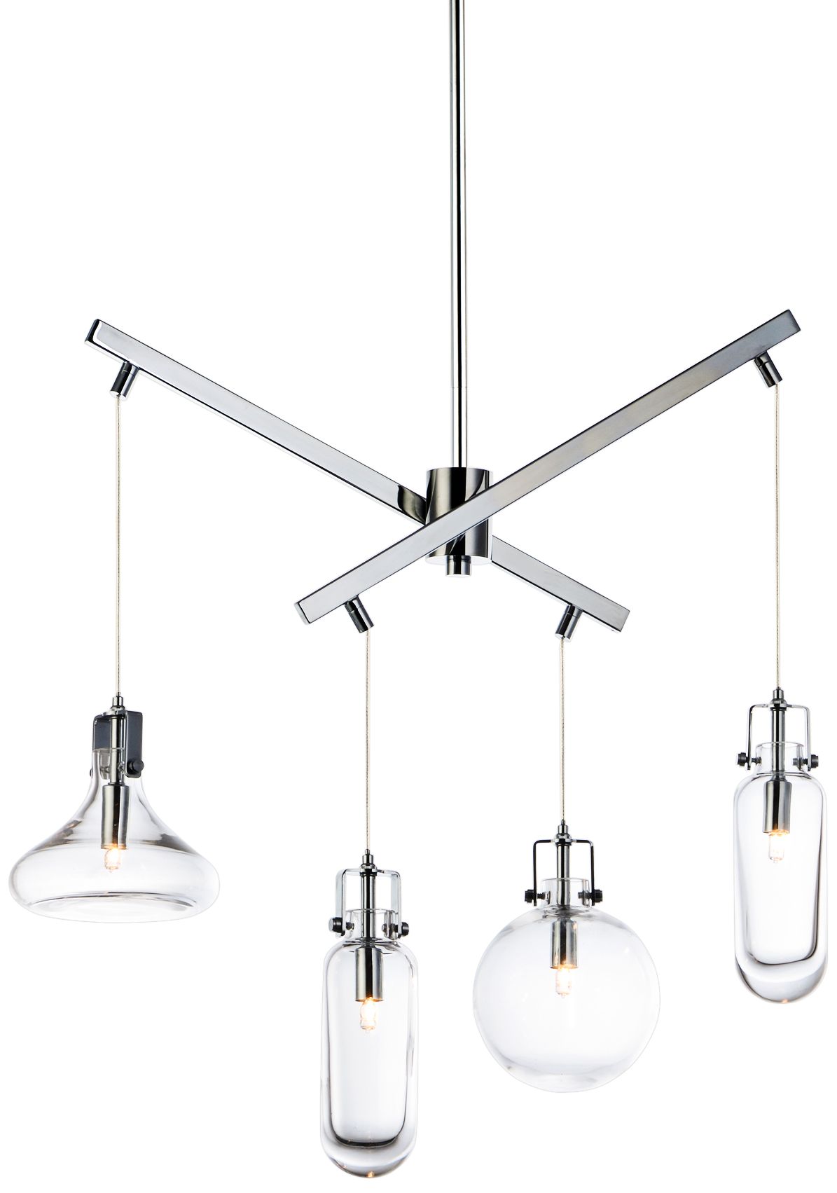 Made from steel and glass, ET2 Lighting's modern Kem multi light pendant features four interestingly shaped lights. A polished chrome X-shape design suspends the glass lights above everything from kitchens to living rooms to office spaces. This dimmable style directs light downward for the most gorgeous glow.