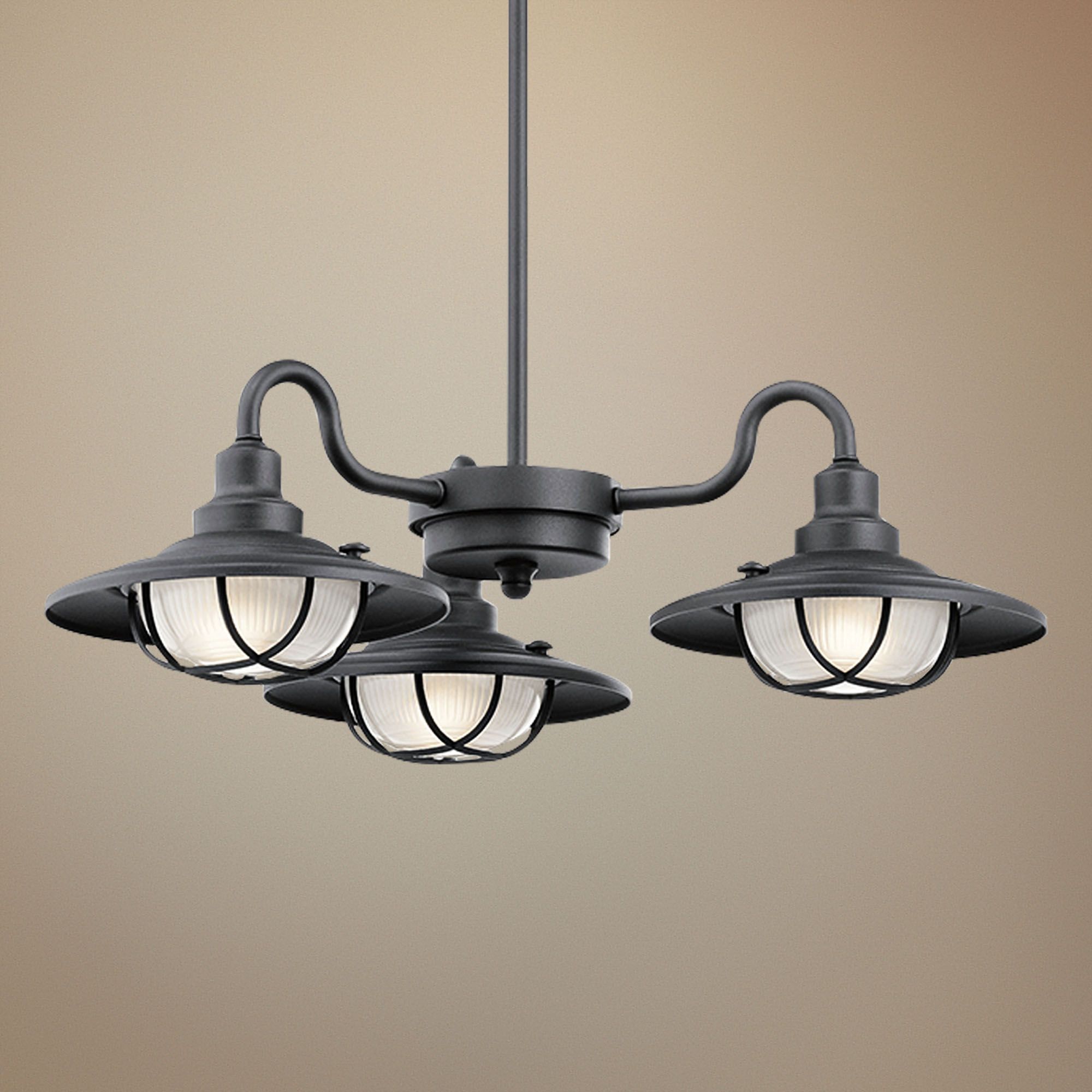 Upgrade your exterior lighting with the brilliant style of this contemporary 3-light outdoor chandelier. Boasting a textured black finish, this chandelier sports bold curves that are sure to capture attention. Each of three lights features a ribbed glass shade with interior sandblasting and exterior caging, covered with a wide, round canopy. From the Harvest Ridge collection by Kichler.
