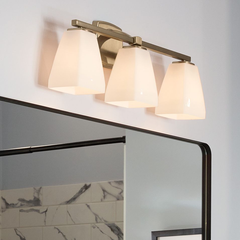 Featuring a clean luxe cast arm and tapered square shades of white opal glass, this contemporary three-light bath light offers an expansive and alluring glow.