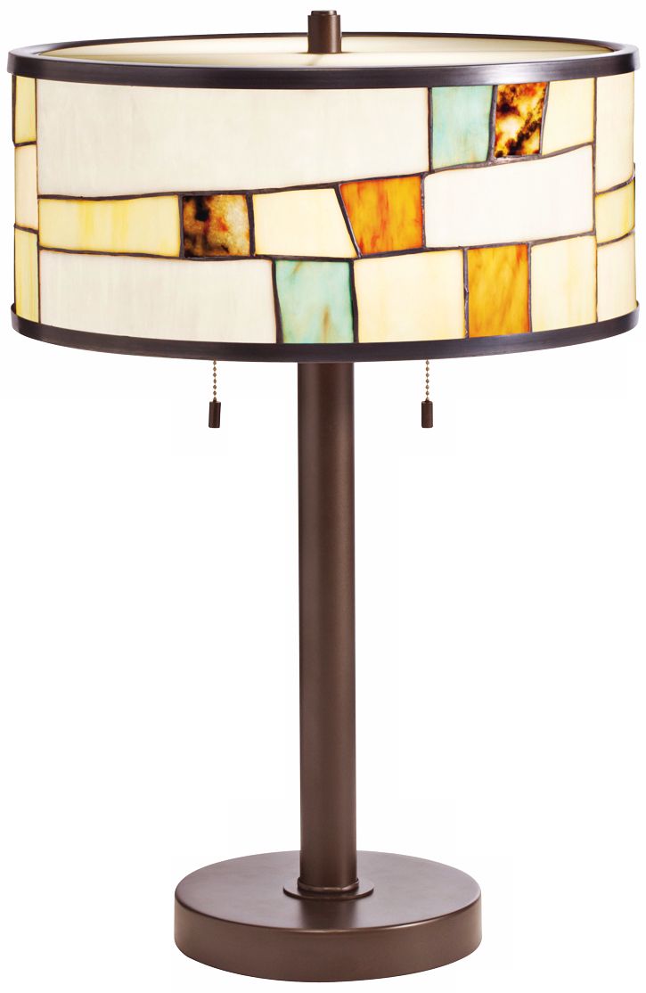 Steel constructed base is designed simply and finished in warm shadow bronze. Tiffany style art glass drum shade features whites, oranges and natural browns with cut stone accents. Twin pulls operate the two lights independently in this updated vintage-look table lamp.