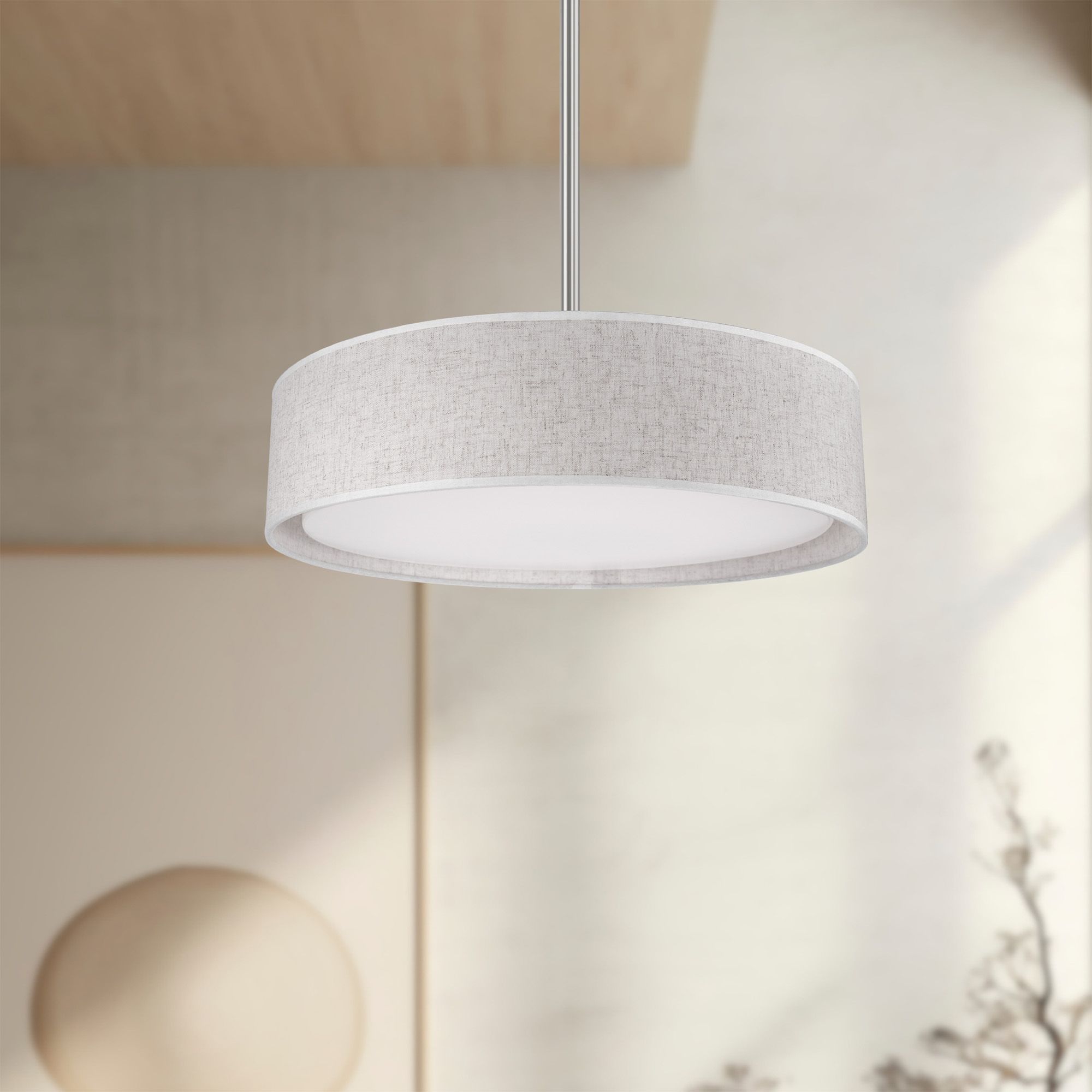 An organza or textured linen band surrounds a concentric polymeric diffuser spreading even light from the LED source. Finely handtailored the fabric shade contributes a soft sophistication to the modern interior. Applicable as a flush mount pendant and in numerous sizes and fabric colors to suit your context.