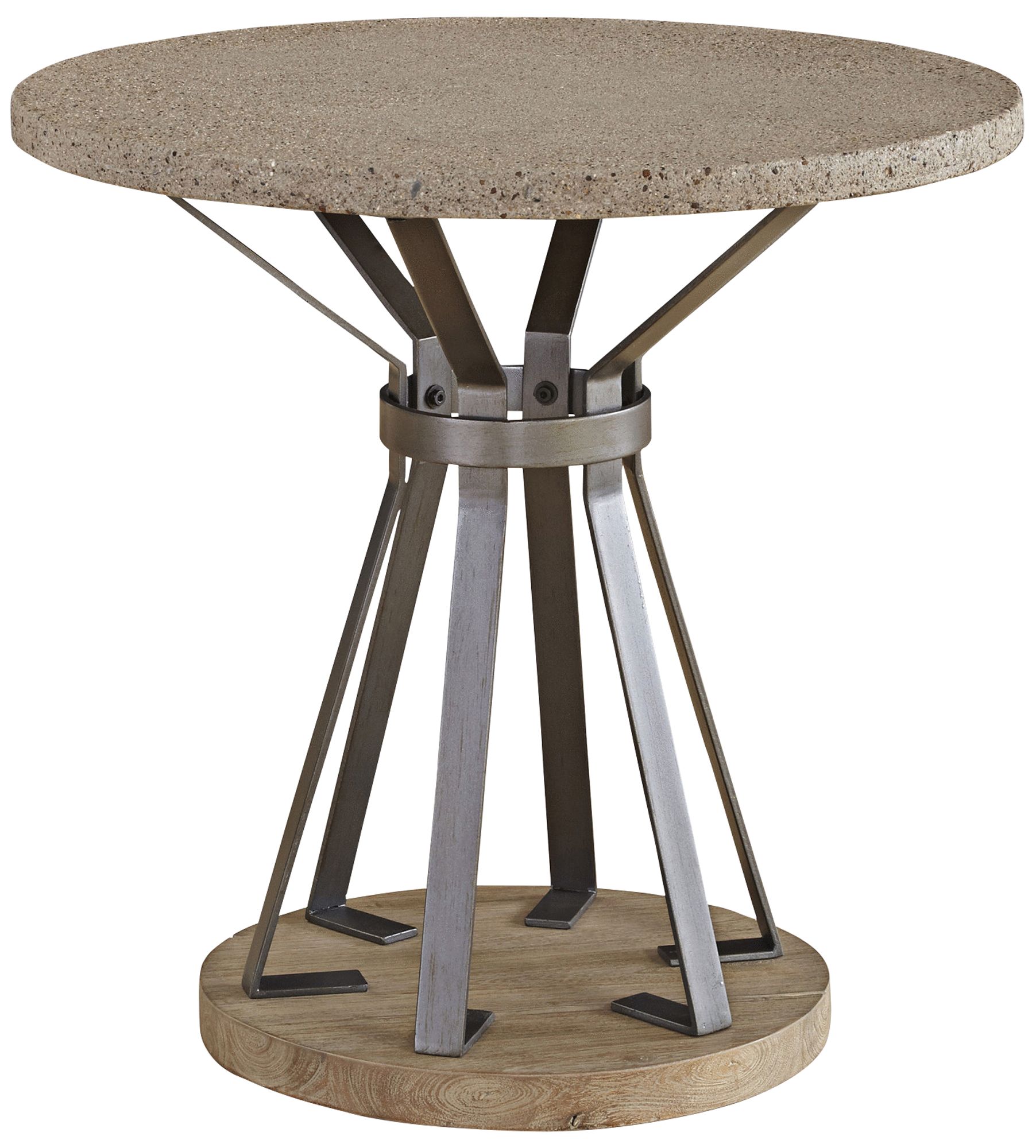 Bring drama to your industrial living space with this exceptional mixed material round end table. Featuring a textured gray concrete top, the table boasts warm steel finish straps and embedded rivets over a worn acacia wood base.