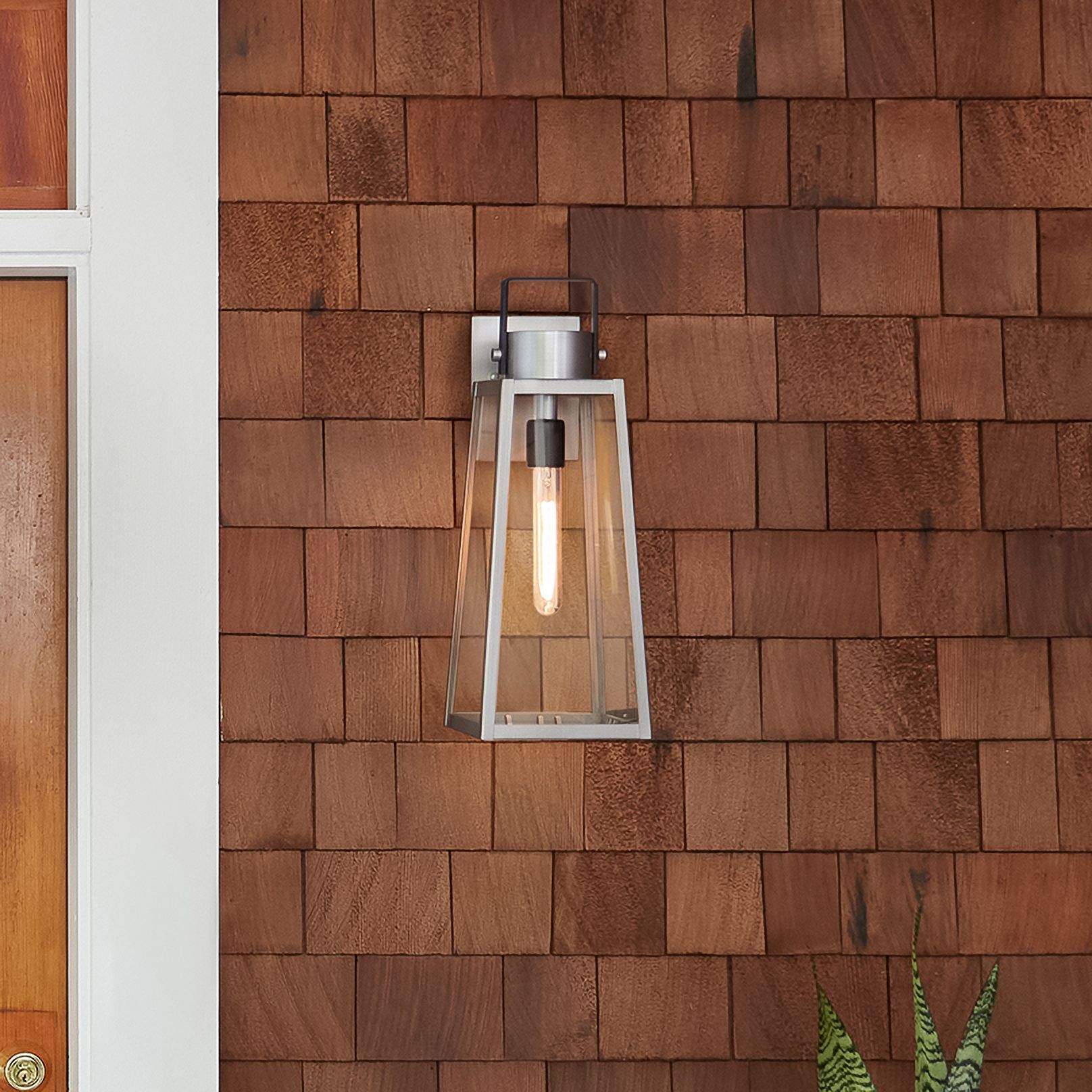 Hype up your alfresco area with the Hugh outdoor lantern and its sleek transitional style. The trapezoidal design features bold, over-scaled clear glass panes framed by carefully curated two-tone metal finish options to inject a modern edge. Choose from classic Antique Brushed Aluminum with a matte Black accent or a rich Black with a warm Burnished Bronze accent. Pro tip: we recommend a tubular vintage filament bulb to make Hugh pop on porches and patios or amp up any exterior space.