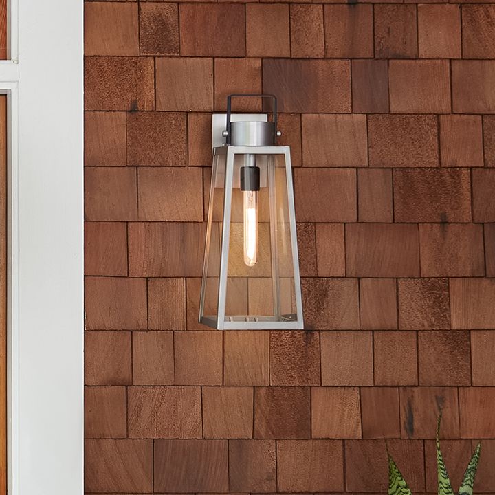 Hype up your alfresco area with the Hugh outdoor lantern and its sleek transitional style. The trapezoidal design features bold, over-scaled clear glass panes framed by carefully curated two-tone metal finish options to inject a modern edge. Choose from classic Antique Brushed Aluminum with a matte Black accent or a rich Black with a warm Burnished Bronze accent. Pro tip: we recommend a tubular vintage filament bulb to make Hugh pop on porches and patios or amp up any exterior space.