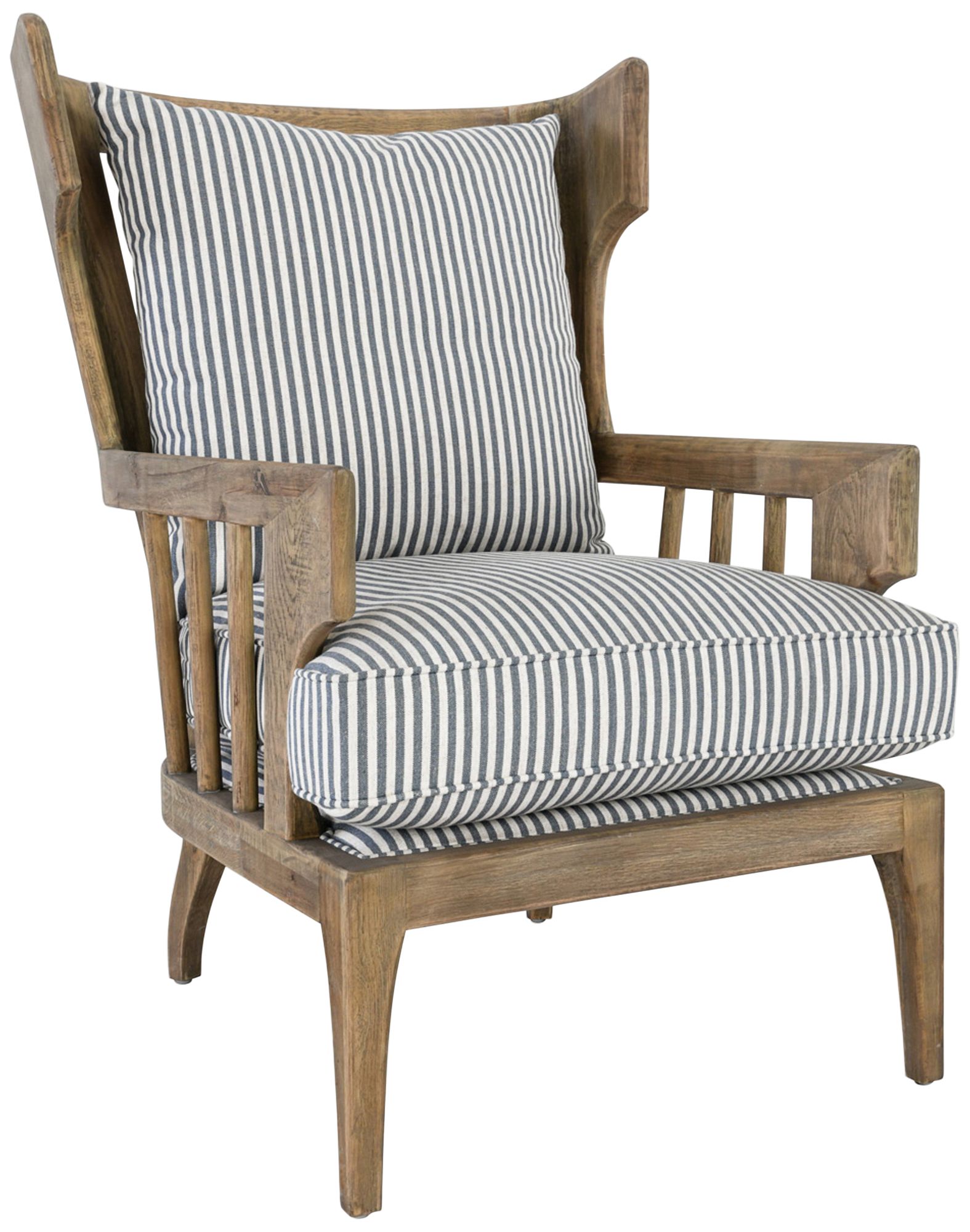 Center this slatted accent chair in a casual space to provide comfy seating and a designer look. An engaging silhouette features slats and angles in an oak wood frame with a neutral finish. This chair from the Lawrence collection offers comfy seating on cushions covered in gray and white striped poly and linen fabric.