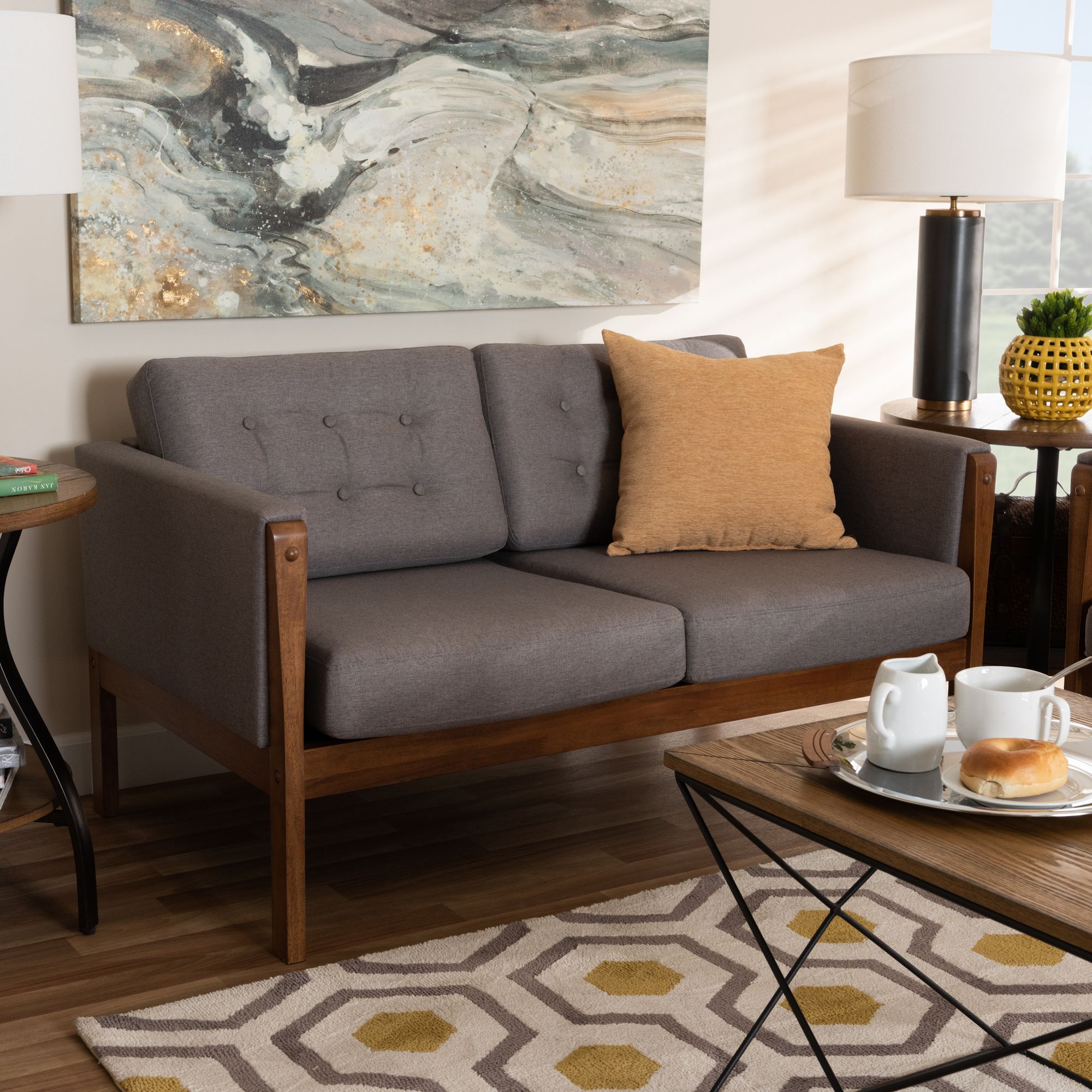 Bring a casual contemporary sophistication to your living room with this Mid-Century Modern-inspired loveseat. Made from a rubberwood frame with a rich walnut brown finish, it has bold lines, track arms, and hand-crafted tufted detailing to add a stylish modern edge to your decor. The gray fabric cushions are non-removable.
