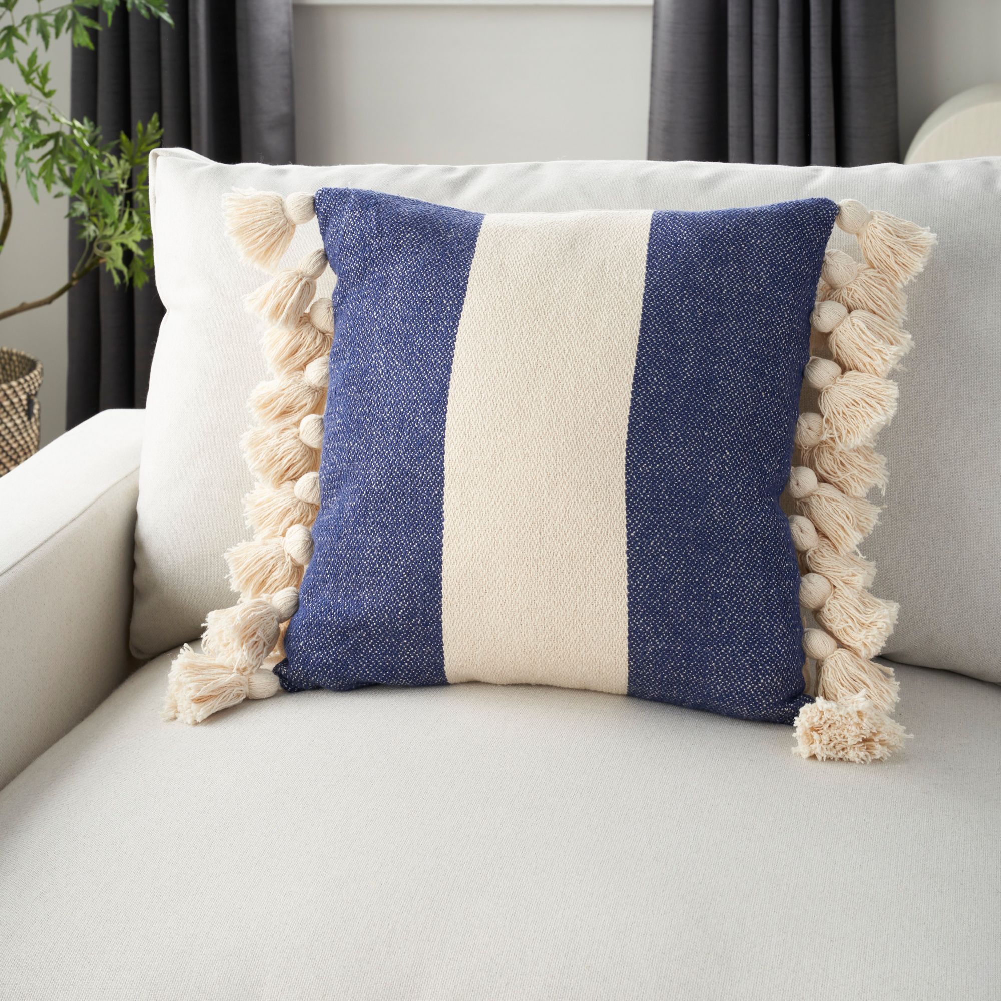 The power of bold stripes goes a long way to add an energetic ambiance, making this modern throw pillow a superb choice for any living area. This contemporary square decorative throw pillow from the Life Styles collection by Mina Victory for Nourison features careful, thick striping in ink blue over ivory on its front, and a solid back. Wrapped in both cotton/poly blend and solid cotton, it maintains a plump feel with a 100 percent polyester insert accessible through a zipper closure. This hand-made pillow is embellished with ornate edge tassels.