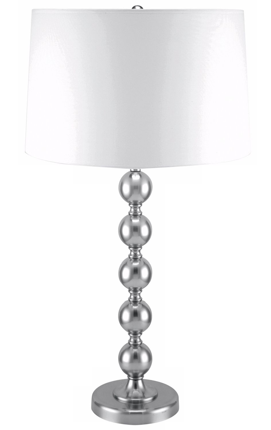 The classic candlestick table lamp is given a contemporary spin in polished steel. White fabric shade. 3-way socket for better lighting control. From the Lite Source lighting collection.