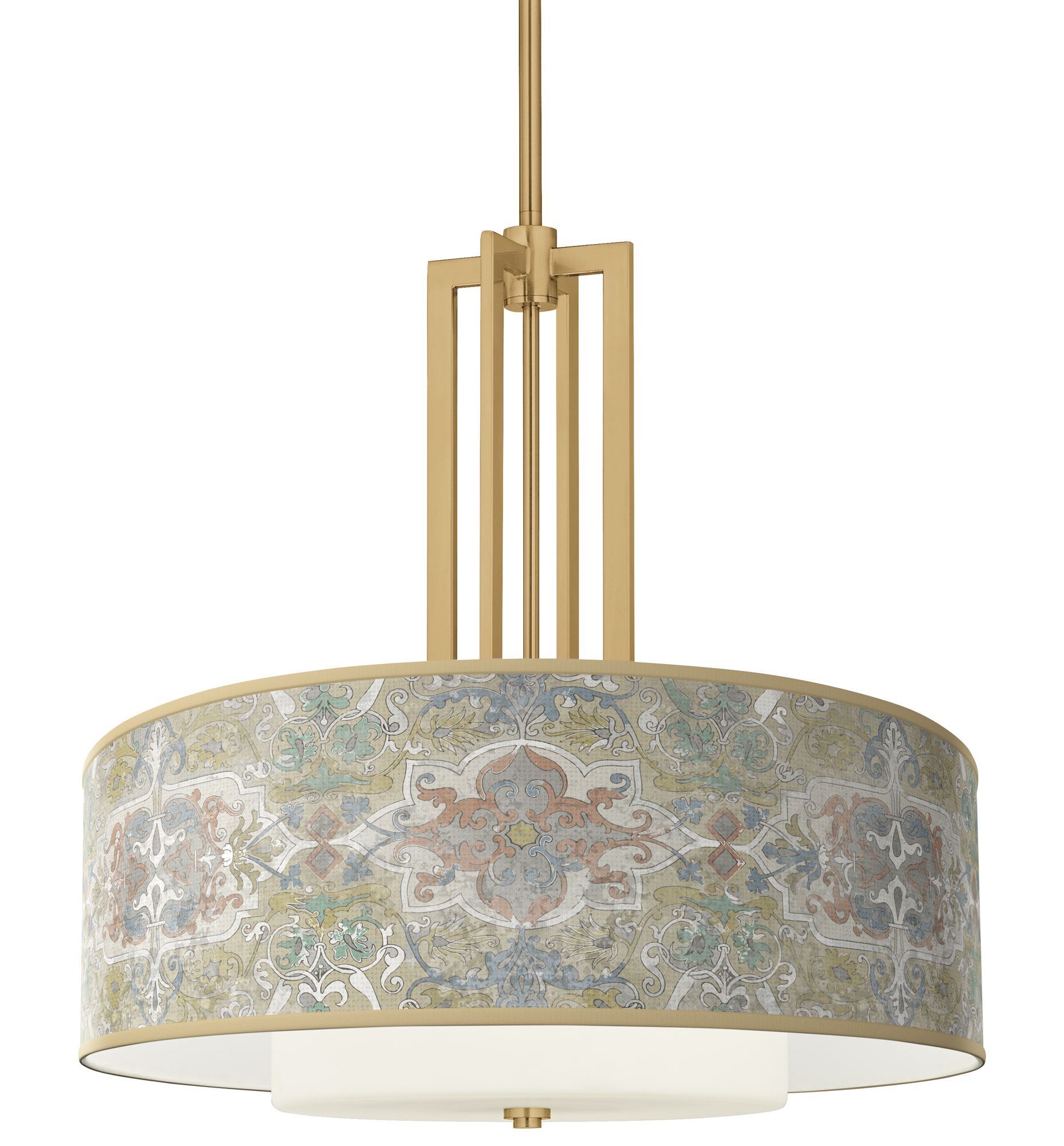 - Soft gold finish metal frame. Double drum shade design, with a Lucrezia giclee print outer shade around a frosted glass inner shade.