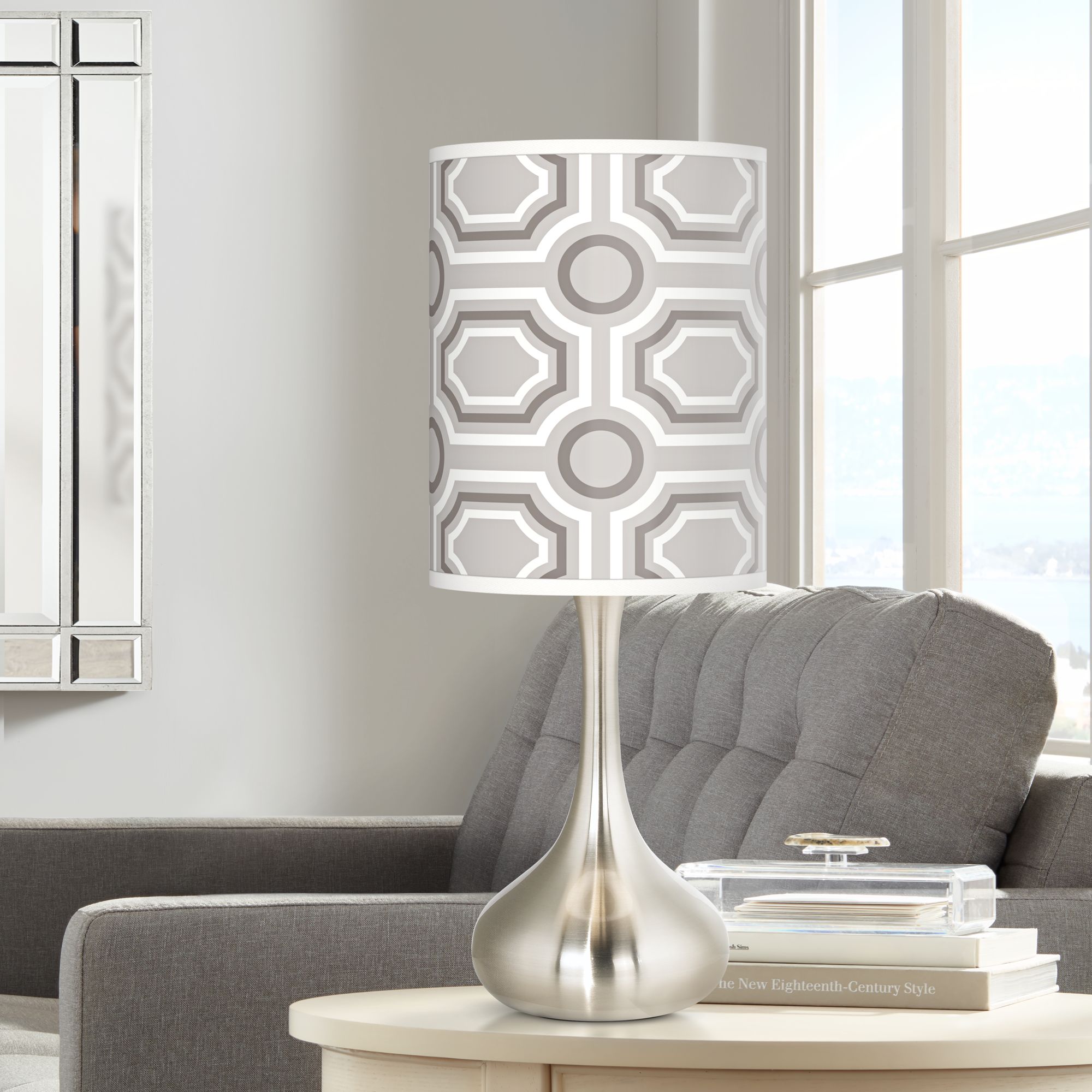 The timeless and sophisticated Luxe Tile giclee print offers balanced symmetry to this contemporary brushed nickel table lamp.