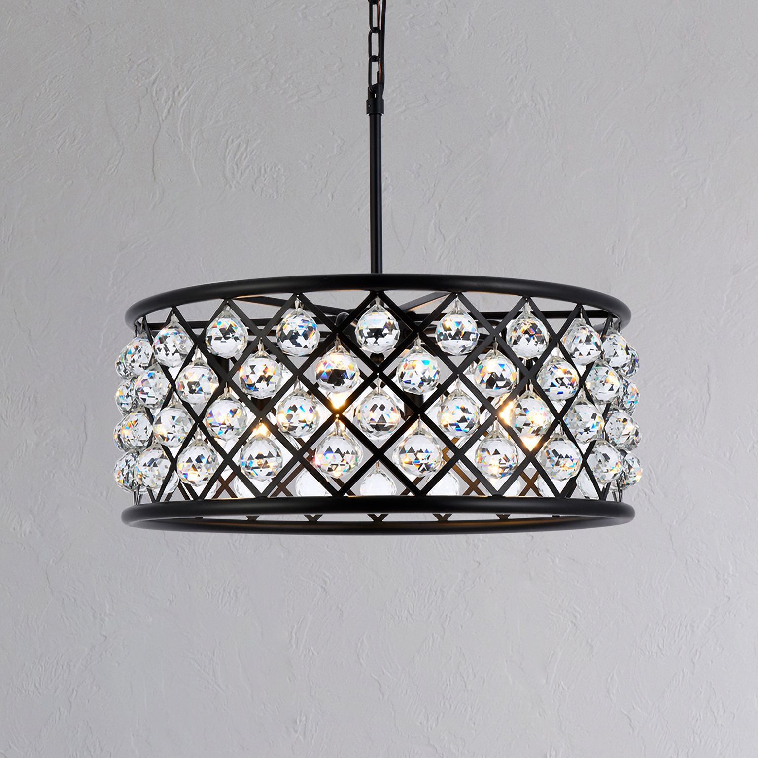 From the Madison collection comes a bold statement in mixed-motif design, as this transitional six-light chandelier presents both rugged style and a touch of glam. With a drum silhouette made of matte black finish steel, its frame offers lattice-cut open charm, showcasing clear crystal drops forming a sparkling light source. A bit industrial and a touch romantic, this transitional fixture makes itself at home in a mid-sized dining space, living room, or bedroom.